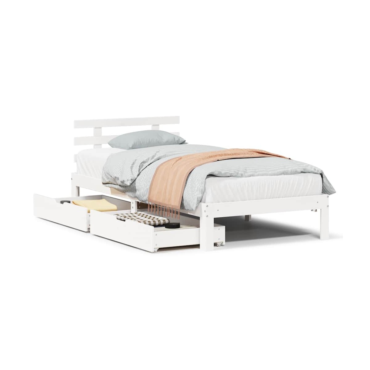 Consigue un sueño más reparador con esta estructura de cama. Es un aporte acogedor para cualquier dormitorio. Estructura estable y duradera: La madera de pino maciza es conocida por su resistencia y durabilidad. Sus vetas rectas y sus característicos nudos contribuyen a su encanto rústico.Somier de láminas para un soporte óptimo: La estructura de cama está equipada con un somier de láminas para el apoyo y la transpirabilidad del colchón.Espacio de almacenamiento extra: Esta base de cama cuenta con dos cajones debajo, lo que proporciona almacenamiento para artículos como ropa de cama, ropa de temporada y juguetes.Cabecero versátil: Este somier viene con un cabecero que proporciona un excelente soporte para la espalda cuando te sientas en la cama para leer o ver la televisión, a la vez que sirve como elemento decorativo.Maniobrabilidad sin esfuerzo: Este cajón de almacenamiento bajo la cama cuenta con cuatro ruedas, que proporcionan una maniobrabilidad suave y sin esfuerzo para deslizarse dentro y fuera de debajo de tu cama. Información útil:El colchón no está incluido con la cama. Disponemos de una variada selección de colchones. Puedes echar un vistazo a nuestra tienda para buscar el colchón correspondiente.