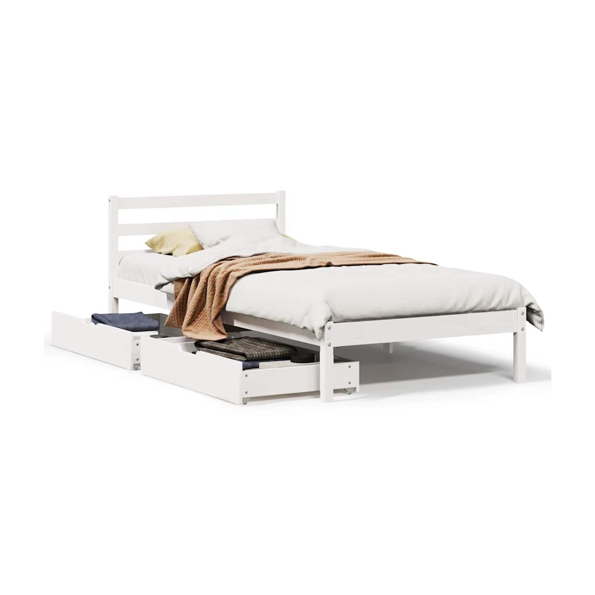 Consigue un sueño más reparador con esta estructura de cama. Es un aporte acogedor para cualquier dormitorio. Estructura estable y duradera: La madera de pino maciza es conocida por su resistencia y durabilidad. Sus vetas rectas y sus característicos nudos contribuyen a su encanto rústico.Somier de láminas para un soporte óptimo: La estructura de cama está equipada con un somier de láminas para el apoyo y la transpirabilidad del colchón.Aprovecha al máximo el espacio: Esta estructura de cama cuenta con dos cajones debajo, que proporcionan almacenamiento para artículos como ropa de cama extra, ropa de temporada y juguetes.Maniobrabilidad sin esfuerzo: Este cajón de almacenamiento bajo la cama cuenta con cuatro ruedas, que proporcionan una maniobrabilidad suave y sin esfuerzo para deslizarse dentro y fuera de debajo de tu cama. Información útil:El colchón no está incluido con la cama. Disponemos de una variada selección de colchones. Puedes echar un vistazo a nuestra tienda para buscar el colchón correspondiente.