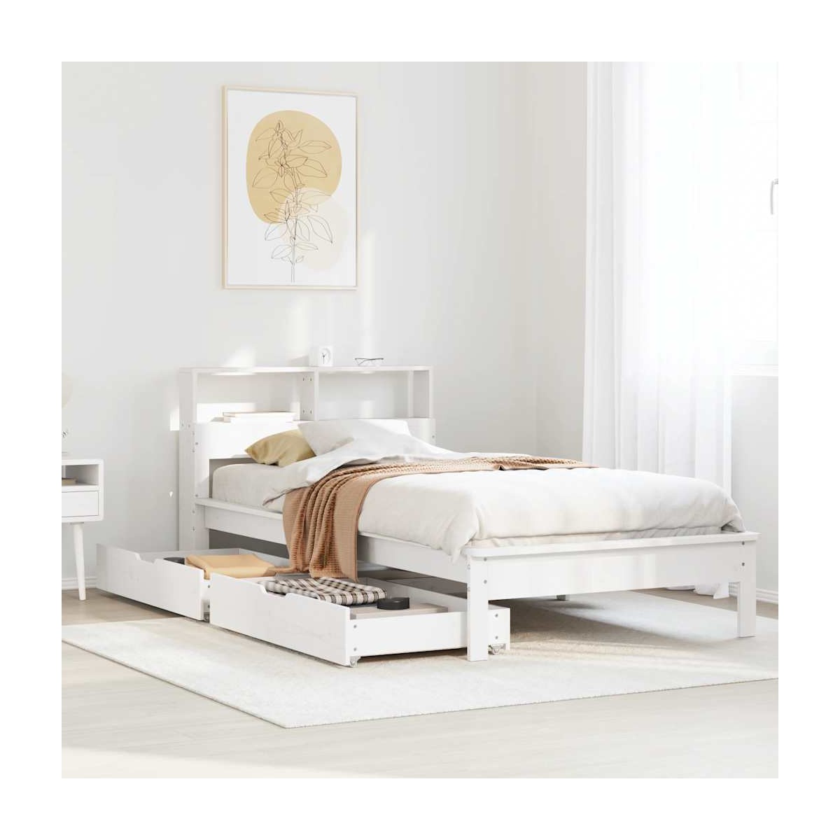 ¡Consigue una mejor noche de sueño reparador con esta cama con estantería! Es un aporte acogedor para cualquier dormitorio. Estructura estable y duradera: La madera de pino maciza es conocida por su resistencia y durabilidad. Sus vetas rectas y sus característicos nudos contribuyen a su encanto rústico.Somier de láminas para un soporte óptimo: El base de cama está equipado con un somier de láminas para el apoyo y la transpirabilidad del colchón.Maniobrabilidad sin esfuerzo: Este cajón de almacenamiento bajo la cama cuenta con cuatro ruedas, que proporcionan una maniobrabilidad suave y sin esfuerzo para deslizarse dentro y fuera de debajo de tu cama.Patas estables y duraderas: Este somier está sostenido por patas resistentes, lo que garantiza estabilidad, seguridad y firmeza.Ahorro de espacio: Este cabecero es una opción de ahorro de espacio que puede sustituir la necesidad de una mesilla de noche, ayudando a maximizar el espacio de tu dormitorio, y haciéndolo ideal para espacios pequeños o limitados. Información útil:El colchón no está incluido con la cama. Disponemos de una variada selección de colchones. Puedes echar un vistazo a nuestra tienda para buscar el colchón correspondiente.