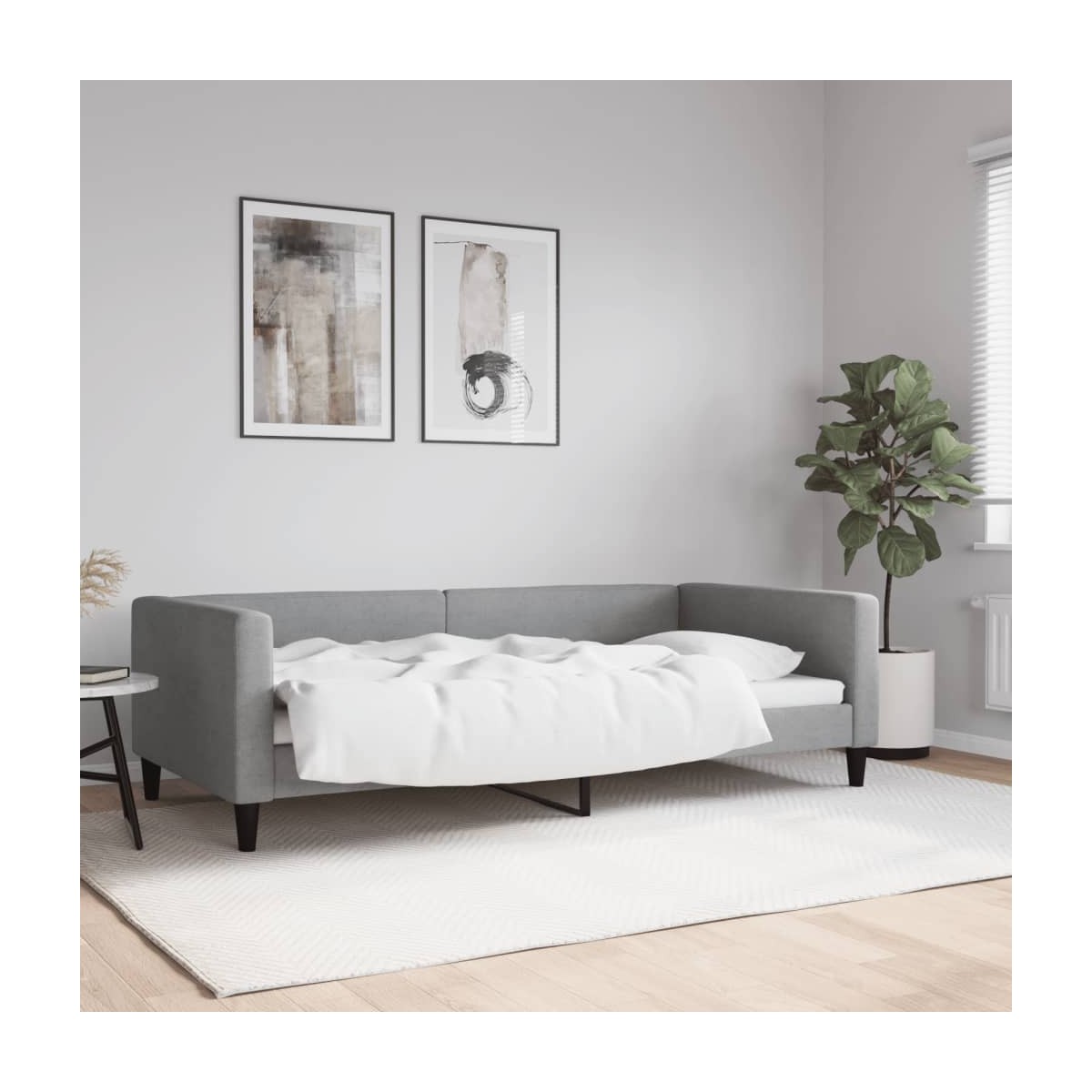 Este sofá cama 2 en 1, que sirve tanto de sofá como de cama, es un complemento práctico y llamativo para el salón o el dormitorio. Sofá cama versátil: El sofá cama puede utilizarse como sofá durante el día o como cama por la noche, para tener una solución rápida para alojar a invitados que pasen la noche.Experiencia confortable: El sofá cama está hecho de tela. La tela posee un aspecto sencillo y limpio, además de ser transpirable y duradera. Asimismo, el respaldo y los reposabrazos de la cama de invitados están acolchados con espuma para mejorar la comodidad.Estructura robusta y estable: La estructura principal del sofá cama está hecha de metal y madera maciza, por lo que es muy resistente y duradero. Estos listones de madera contrachapada permiten una mejor circulación del aire con el fin de mantener el colchón fresco durante más tiempo, además de mejorar la capacidad de peso y garantizar la estabilidad.Diseño moderno: ¡El sofá cama tiene un diseño moderno con líneas nítidas, un aspecto minimalista, así como luz natural, y añadirá un estilo moderno a la casa! Información útil:El colchón no está incluido con la cama. Disponemos de una variada selección de colchones. Puedes echar un vistazo a nuestra tienda para buscar el colchón correspondiente.