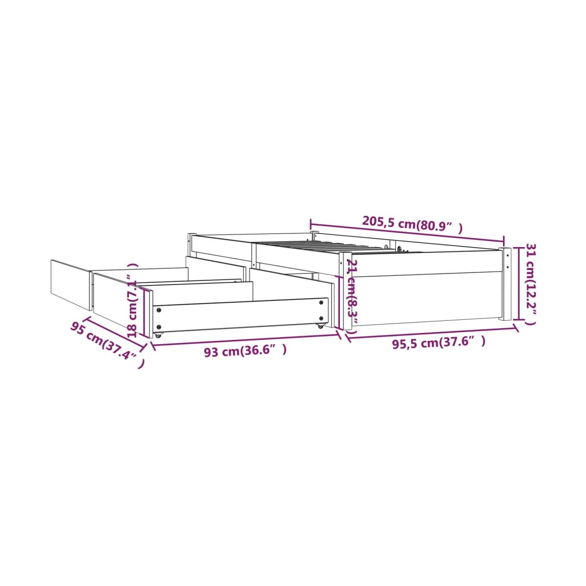 - Dimensiones totales: 205,5 x 95,5 x 31 cm (largo x ancho x alto)