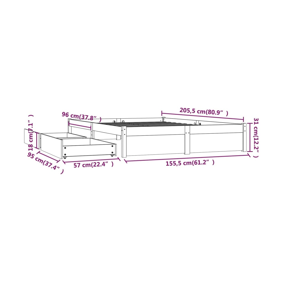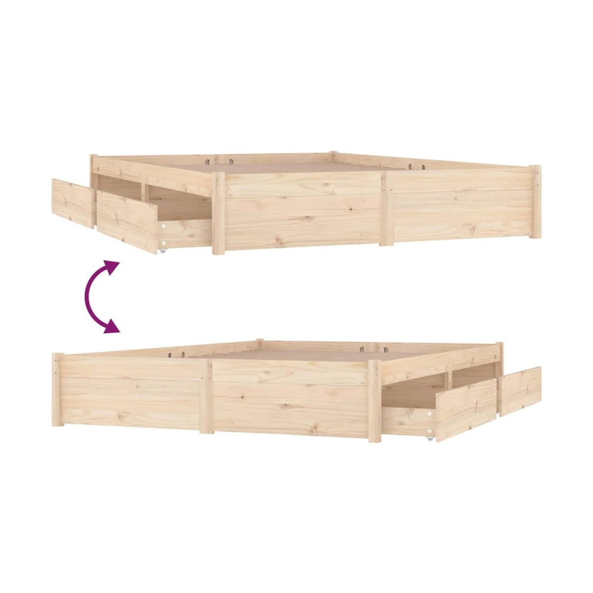 Con un diseño sencillo pero atemporal, esta estructura de cama está pensada para ser un aporte verdaderamente práctico y decorativo para tu dormitorio. Madera de pino maciza: La madera de pino maciza es un bonito material natural. La madera de pino tiene vetas rectas, y los nudos dan al material su distintivo aspecto rústico.Listones robustos: Los listones de madera contrachapada proporcionan una buena distribución del peso, lo que garantiza que el colchón se mantenga en tu sitio con cada giro y vuelta del cuerpo mientras duermes.Función de almacenaje: Los cajones de cama incluidos proporcionan amplio espacio de almacenamiento para guardar cosas básicas, y mantienen la habitación limpia y ordenada. Nota:La entrega incluye únicamente una estructura de cama. Los colchones no están incluidos. Puedes echar un vistazo a nuestra tienda para buscar el correspondiente colchón.Esta estructura de cama es adecuada para un colchón de 150 x 200 cm (tamaño King Size).