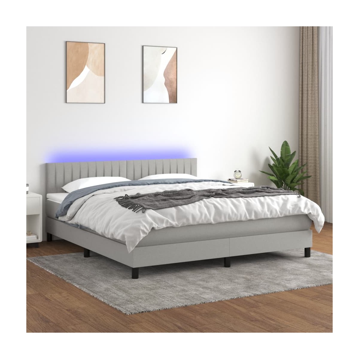 Utiliza esta cama tipo box spring con colchón y luces LED para disfrutar de un sueño reparador. Será el centro de atención del dormitorio. Material de primera calidad: La tela posee un aspecto sencillo y limpio, y es transpirable y duradera.Cabecero práctico: El cabecero de la cama es ajustable en altura según tus preferencias. El cabecero de la cama te proporciona un excelente apoyo para la espalda mientras estás sentado en la cama para leer o ver la televisión.Tira de LED de colores: Alegra la oscuridad con luces LED de colores.Colchón de muelles ensacados: El muelle ensacado individual incorporado es conocido por su altísima calidad, al tiempo que garantiza un alto nivel de durabilidad y adaptabilidad. Puede absorber eficazmente el ruido y los golpes causados por los lanzamientos y los giros.Protector de colchón respetuoso con la piel: El protector de colchón tiene una funda de tejido resistente y respetuoso con la piel, que lo hace suave y confortable. Nota: La lona impermeable no está incluidaPor razones de higiene, el colchón no puede devolverse si se ha quitado o abierto el embalaje.Cada producto viene con un manual de montaje en la caja para facilitar el montaje.Únicamente puedes cortar por la parte con el símbolo de las tijeras y únicamente la parte con el USB seguirá funcionando como antes.El producto tiene un conector USB, pero no se incluye la fuente de alimentación USB de 5 V certificada.