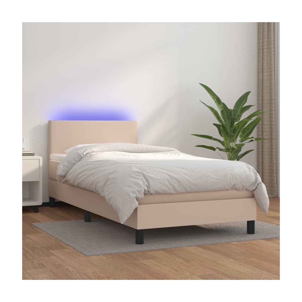 Utiliza esta cama box spring con colchón y LED para disfrutar de un sueño reparador. Es el centro de atención de tu dormitorio. Material duradero: El cuero sintético de primera calidad es un material muy duradero. Es resistente a las manchas, por lo que es fácil de limpiar con un paño húmedo. Además, la superficie lisa da un aspecto lujoso y la belleza del cuero auténtico.Cabecero práctico: El cabecero de la cama es ajustable en altura según tus preferencias. El cabecero de la cama te proporciona un excelente apoyo para la espalda mientras estás sentado en la cama para leer o ver la televisión.Tira de LED de colores: Alegra la oscuridad con luces LED de colores.Colchón de muelles ensacados: El muelle ensacado individual incorporado es conocido por su altísima calidad, al tiempo que garantiza un alto nivel de durabilidad y adaptabilidad. Puede absorber eficazmente el ruido y los golpes causados por los lanzamientos y los giros.Protector de colchón respetuoso con la piel: El protector de colchón tiene una funda de tejido resistente y respetuoso con la piel, que lo hace suave y confortable. Nota:Por razones de higiene, el colchón no puede devolverse si se ha quitado o abierto el embalaje.Cada producto viene con un manual de montaje en la caja para facilitar el montaje.Únicamente puedes cortar por la parte con el símbolo de las tijeras y únicamente la parte con el USB seguirá funcionando como antes.El producto tiene un conector USB, pero no se incluye la fuente de alimentación USB de 5 V certificada.