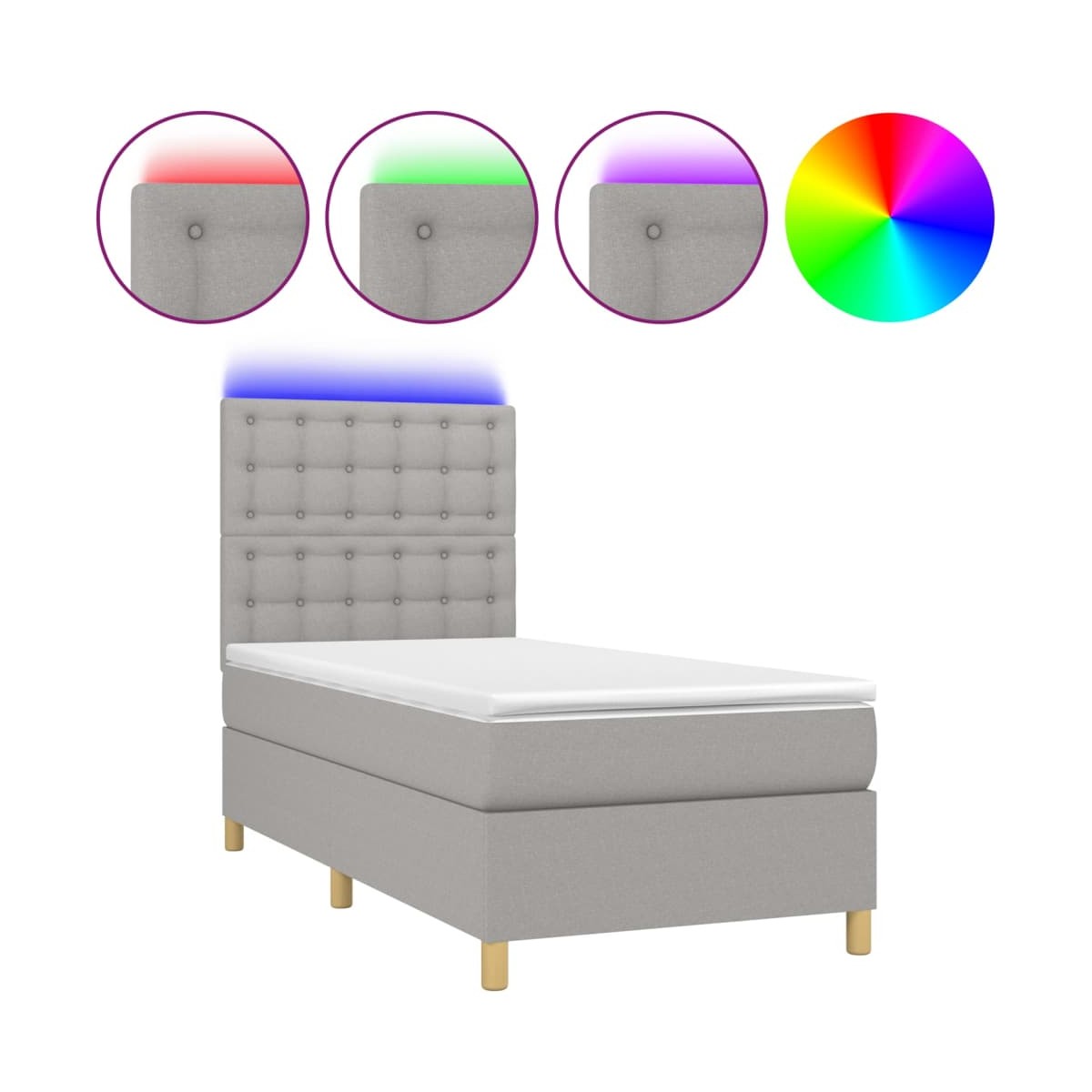 Utiliza esta cama box spring con colchón y LED para disfrutar de un sueño reparador. Es el centro de atención de tu dormitorio. Material de primera calidad: La tela posee un aspecto sencillo y limpio, y es transpirable y duradera.Cabecero práctico: El cabecero de la cama es ajustable en altura según tus preferencias. El cabecero de la cama te proporciona un excelente apoyo para la espalda mientras estás sentado en la cama para leer o ver la televisión.Tira de LED de colores: Alegra la oscuridad con luces LED de colores.Colchón de muelles ensacados: El muelle ensacado individual incorporado es conocido por su altísima calidad, al tiempo que garantiza un alto nivel de durabilidad y adaptabilidad. Puede absorber eficazmente el ruido y los golpes causados por los lanzamientos y los giros.Protector de colchón respetuoso con la piel: El protector de colchón tiene una funda de tejido resistente y respetuoso con la piel, que lo hace suave y confortable. Nota:Por razones de higiene, el colchón no puede devolverse si se ha quitado o abierto el embalaje.Únicamente puedes cortar por la parte con el símbolo de las tijeras y únicamente la parte con el USB seguirá funcionando como antes.Cada producto viene con un manual de montaje en la caja para facilitar el montaje.El producto tiene un conector USB, pero no se incluye la fuente de alimentación USB de 5 V certificada.