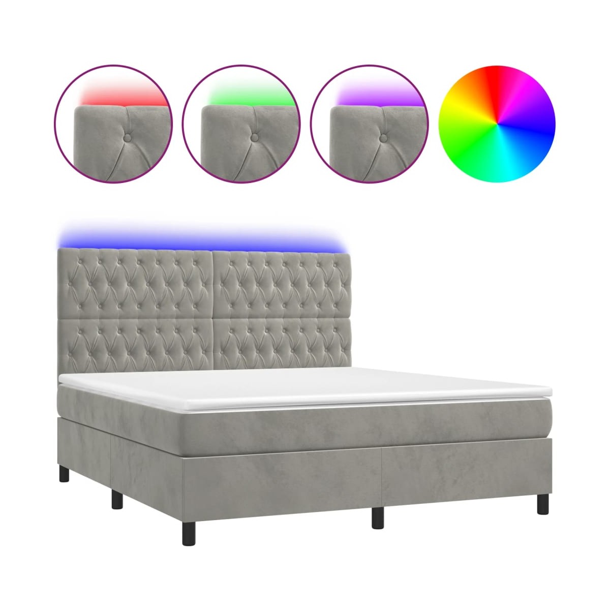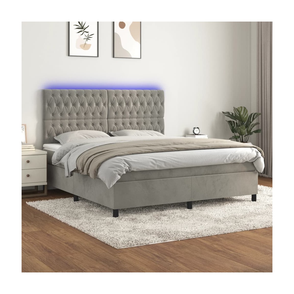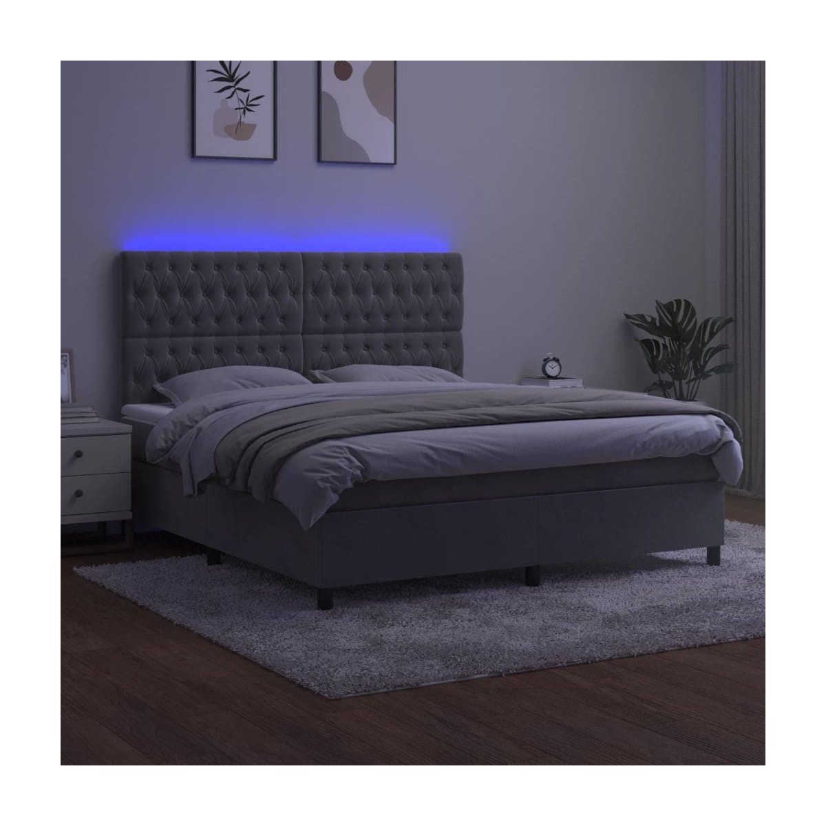 Utiliza esta cama box spring con colchón y LED para disfrutar de un sueño reparador. Es el centro de atención de tu dormitorio. Terciopelo suave: El terciopelo es una tela suave y lujosa, reconocida por su denso pelo de fibras cortadas de forma uniforme que tienen una suave pelusa. La tela de terciopelo posee un característico y suave tacto, lo que hace que sea cómoda al tacto.Cabecero práctico: El cabecero de la cama es ajustable en altura según tus preferencias. El cabecero de la cama te proporciona un excelente apoyo para la espalda mientras estás sentado en la cama para leer o ver la televisión.Tira de LED de colores: Alegra la oscuridad con luces LED de colores.Colchón de muelles ensacados: El muelle ensacado individual incorporado es conocido por su altísima calidad, al tiempo que garantiza un alto nivel de durabilidad y adaptabilidad. Puede absorber eficazmente el ruido y los golpes causados por los lanzamientos y los giros.Protector de colchón respetuoso con la piel: El protector de colchón tiene una funda de tejido resistente y respetuoso con la piel, que lo hace suave y confortable. Nota:Por razones de higiene, el colchón no puede devolverse si se ha quitado o abierto el embalaje.Únicamente puedes cortar por la parte con el símbolo de las tijeras y únicamente la parte con el USB seguirá funcionando como antes.Cada producto viene con un manual de montaje en la caja para facilitar el montaje.El producto tiene un conector USB, pero no se incluye la fuente de alimentación USB de 5 V certificada.