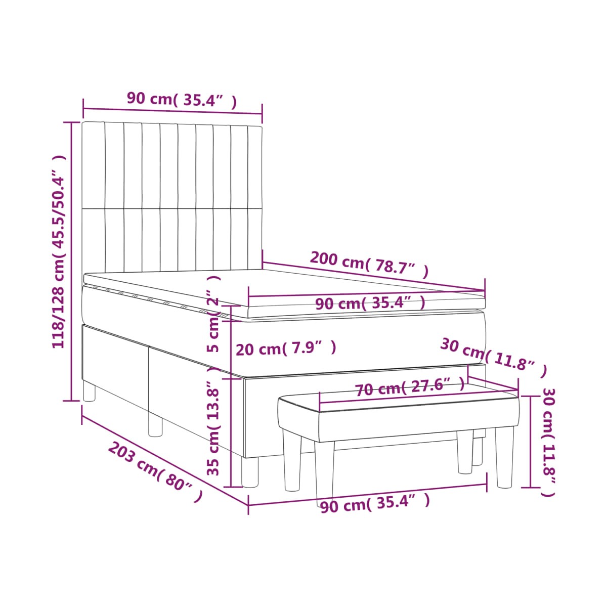 - Dimensiones: 203 x 90 x 118/128 cm (largo x ancho x alto)