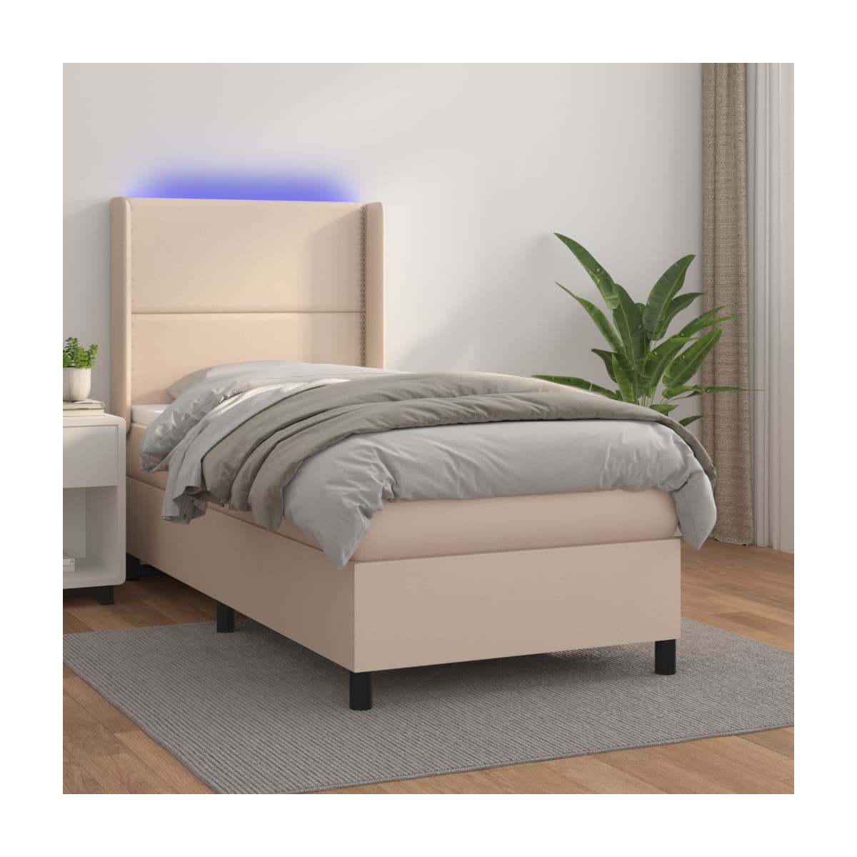 Utiliza esta cama tipo box spring con colchón y luces LED para disfrutar de un sueño reparador. Será el centro de atención del dormitorio. Material duradero: El cuero sintético de primera calidad es un material muy duradero. Es resistente a las manchas, por lo que es fácil de limpiar con un paño húmedo. Además, la superficie lisa da un aspecto lujoso y la belleza del cuero auténtico.Cabecero práctico: El cabecero de la cama es ajustable en altura según tus preferencias. El cabecero de la cama te proporciona un excelente apoyo para la espalda mientras estás sentado en la cama para leer o ver la televisión.Tira de LED de colores: Alegra la oscuridad con luces LED de colores.Colchón de muelles ensacados: El muelle ensacado individual incorporado es conocido por su altísima calidad, al tiempo que garantiza un alto nivel de durabilidad y adaptabilidad. Puede absorber eficazmente el ruido y los golpes causados por los lanzamientos y los giros.Protector de colchón respetuoso con la piel: El protector de colchón tiene una funda de tejido resistente y respetuoso con la piel, que lo hace suave y confortable. Nota:Por razones de higiene, el colchón no puede devolverse si se ha quitado o abierto el embalaje.Únicamente puedes cortar por la parte con el símbolo de las tijeras y únicamente la parte con el USB seguirá funcionando como antes.Cada producto viene con un manual de montaje en la caja para facilitar el montaje.El producto tiene un conector USB, pero no se incluye la fuente de alimentación USB de 5 V certificada.