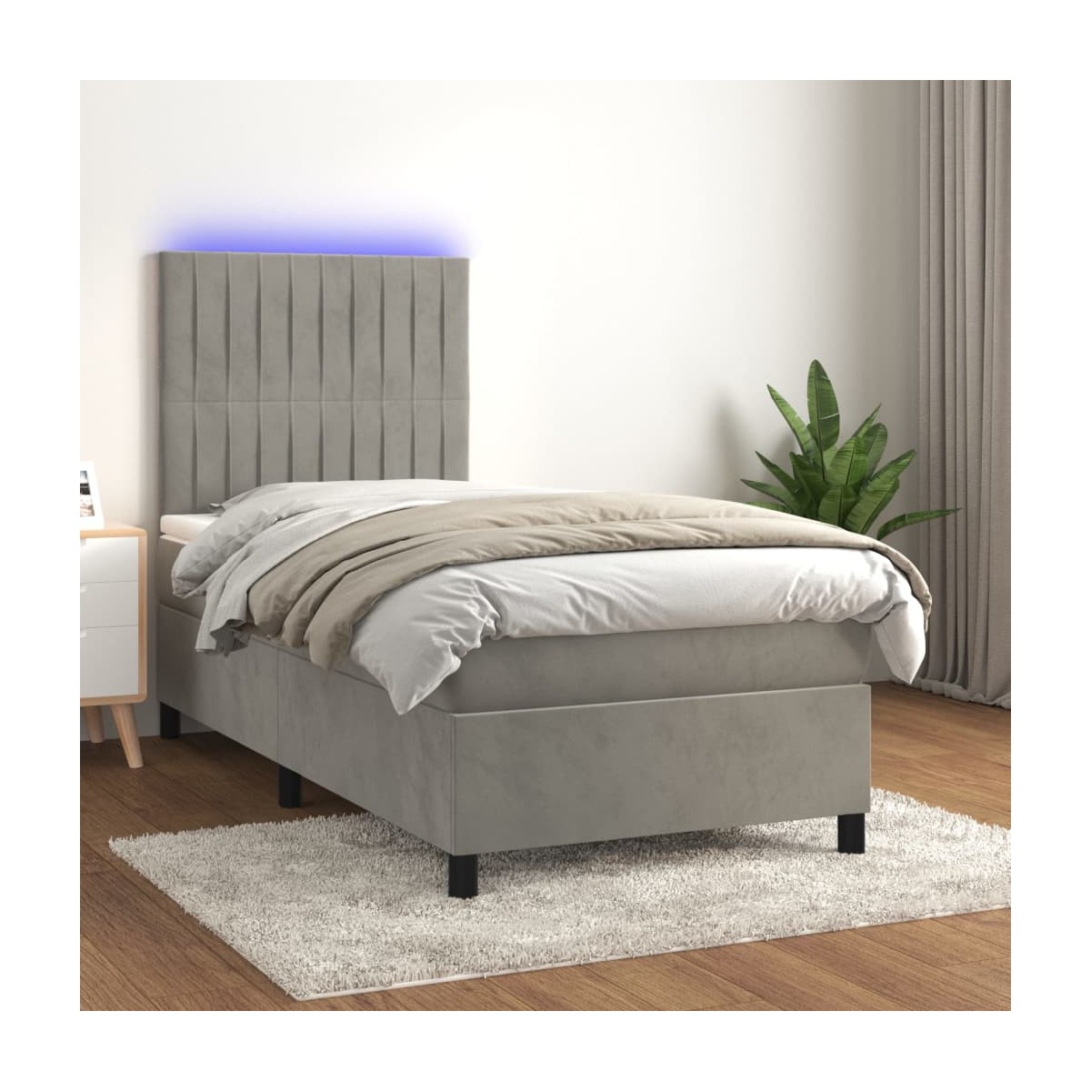 Utiliza esta cama box spring con colchón y LED para disfrutar de un sueño reparador. Es el centro de atención de tu dormitorio. Terciopelo suave: El terciopelo es una tela suave y lujosa, reconocida por su denso pelo de fibras cortadas de forma uniforme que tienen una suave pelusa. La tela de terciopelo posee un característico y suave tacto, lo que hace que sea cómoda al tacto.Cabecero práctico: El cabecero de la cama es ajustable en altura según tus preferencias. El cabecero de la cama te proporciona un excelente apoyo para la espalda mientras estás sentado en la cama para leer o ver la televisión.Tira de LED de colores: Alegra la oscuridad con luces LED de colores.Colchón de muelles ensacados: El muelle ensacado individual incorporado es conocido por su altísima calidad, al tiempo que garantiza un alto nivel de durabilidad y adaptabilidad. Puede absorber eficazmente el ruido y los golpes causados por los lanzamientos y los giros.Protector de colchón respetuoso con la piel: El protector de colchón tiene una funda de tejido resistente y respetuoso con la piel, que lo hace suave y confortable. Nota:Por razones de higiene, el colchón no puede devolverse si se ha quitado o abierto el embalaje.Únicamente puedes cortar por la parte con el símbolo de las tijeras y únicamente la parte con el USB seguirá funcionando como antes.Cada producto viene con un manual de montaje en la caja para facilitar el montaje.El producto tiene un conector USB, pero no se incluye la fuente de alimentación USB de 5 V certificada.