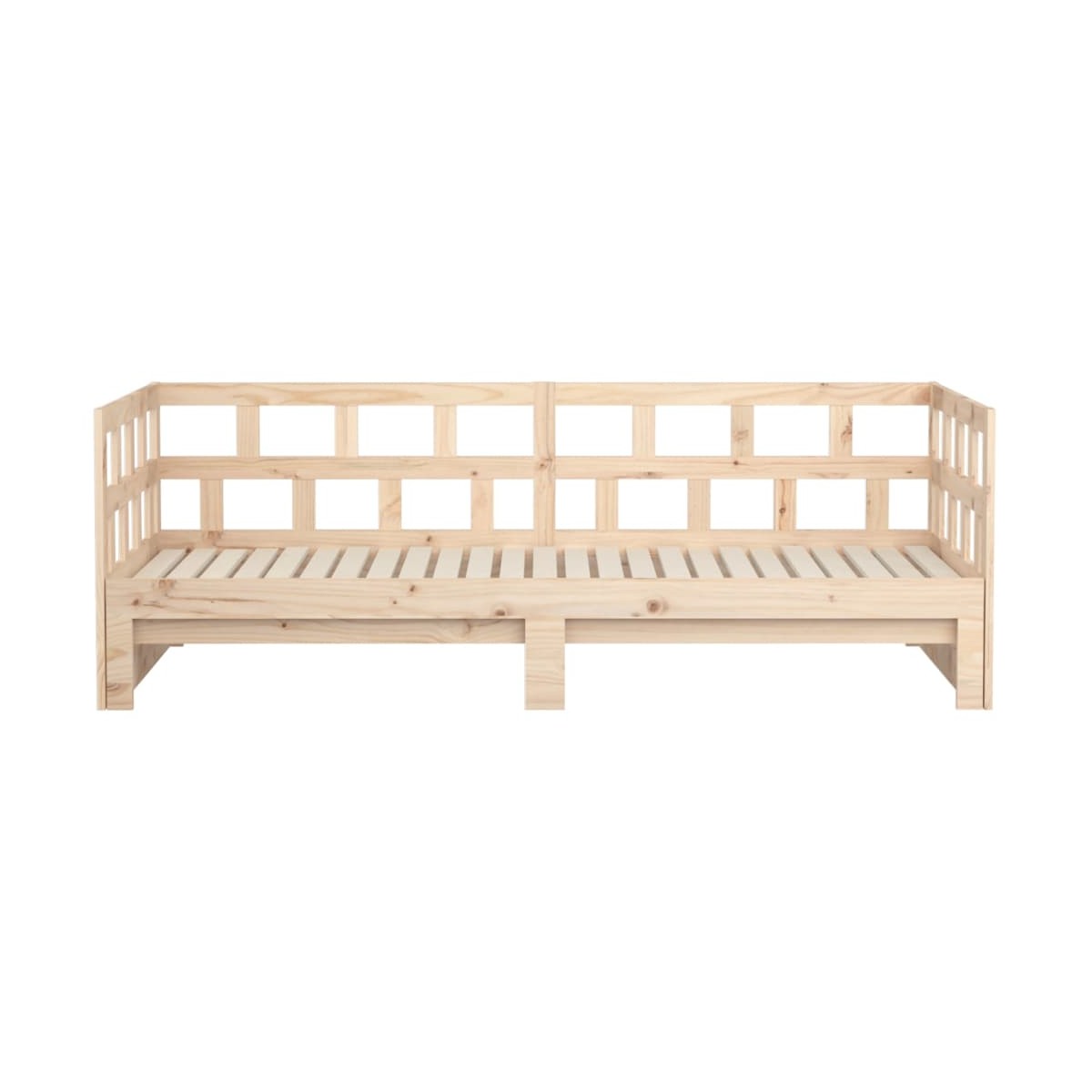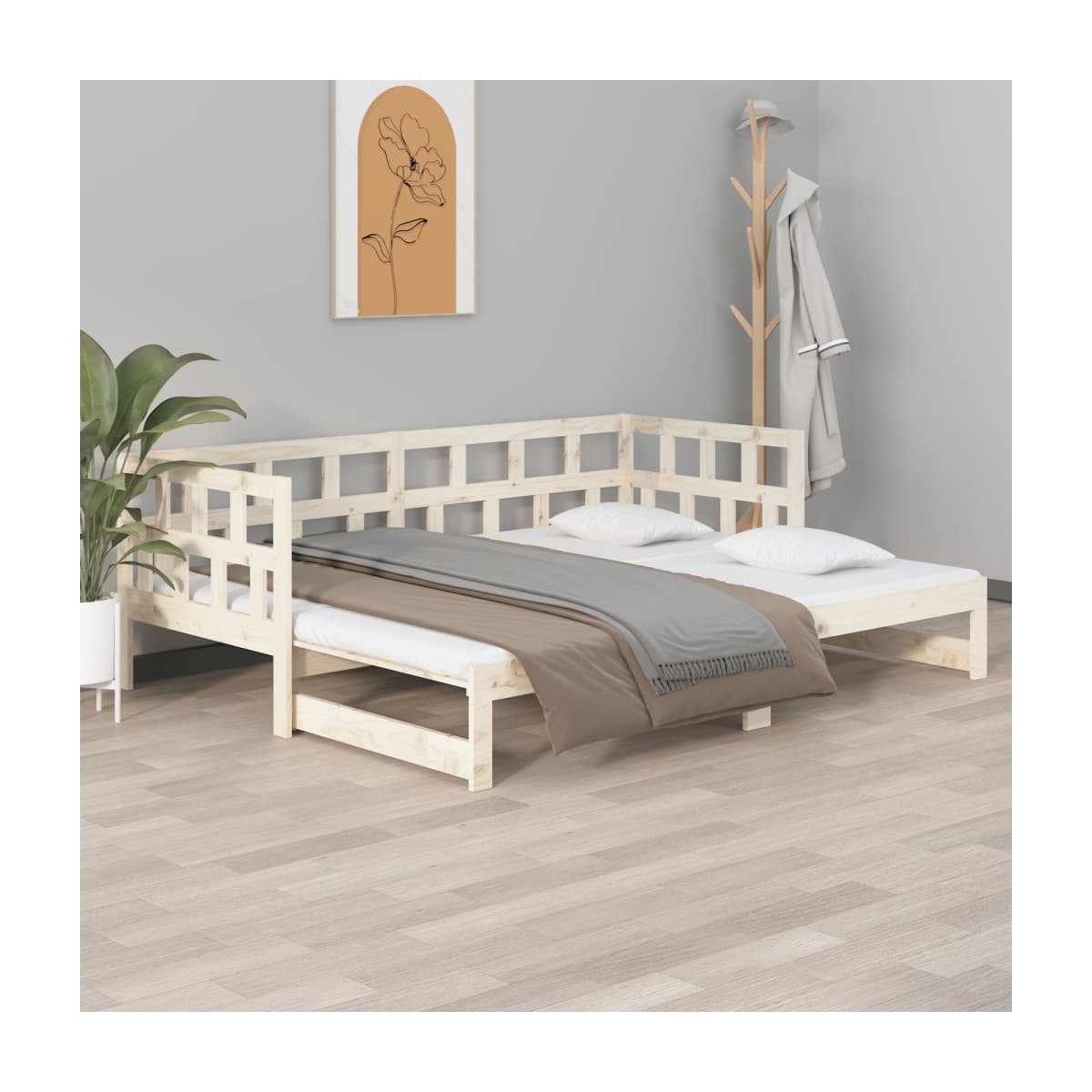 Esta cama de día de madera multifuncional puede utilizarse como sofá durante el día, o como cama por la noche para ofrecer una solución rápida para alojar a los invitados que pasen la noche. Material de primera calidad: La madera maciza de pino es un bonito material natural. La madera de pino tiene vetas rectas, y los nudos dan al material su distintivo aspecto rústico.Cama extraíble: Esta práctica cama de huéspedes de madera se puede convertir fácilmente en un sofá durante el día y en una cómoda cama para dos personas por la noche, incluso en un espacio limitado.Tablero lateral de apoyo: Este sofá cama está equipado con un tablero lateral que impide que el usuario se caiga mientras duerme, dándole una sensación de seguridad. Nota:Ten en cuenta que la entrega incluye únicamente una estructura de cama. El colchón no está incluido. Puedes echar un vistazo a nuestra tienda para buscar el correspondiente colchón.