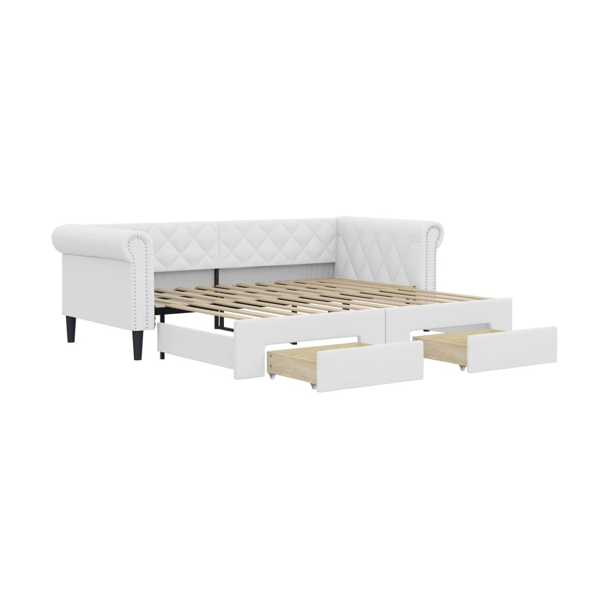 Este sofá cama 2 en 1 con cama nido, que sirve como sofá y cama, es un complemento práctico y llamativo para tu salón o dormitorio. Sofá cama versátil: El sofá cama funciona como sofá durante el día y se convierte fácilmente en una cama doble por la noche sacando la cama nido, lo que proporciona una solución práctica para recibir invitados y maximizar el espacio.Amplio espacio de almacenamiento: Esta cama de invitados tiene dos cajones con ruedas que brindan un amplio espacio para guardar ropa, calcetines, juguetes, cojines, etc.Cuero sintético duradero y construcción maciza: Este sofá cama tiene una estructura resistente, hecha de madera y metal, y está tapizado con cuero sintético duradero y fácil de limpiar.Diseño moderno: ¡El sofá cama tiene un diseño moderno con líneas nítidas, un aspecto minimalista, así como luz natural, y añadirá un estilo moderno a la casa! Información útil:El colchón no está incluido con la cama. Ofrecemos una variada selección de colchones. Puedes echar un vistazo a nuestra tienda para buscar el correspondiente colchón.