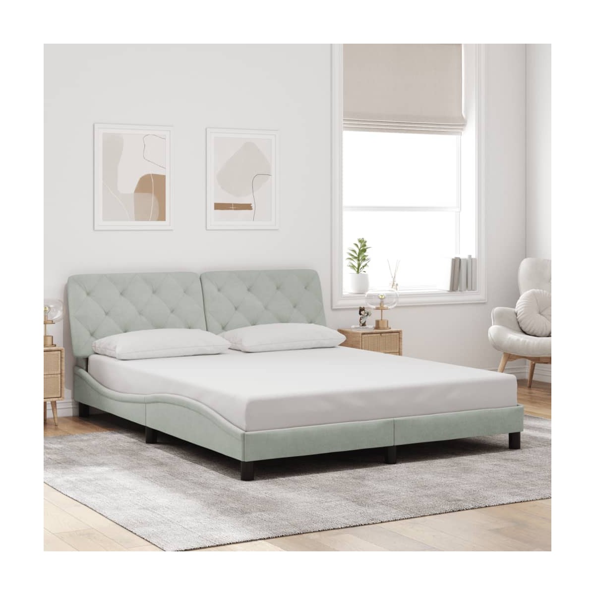 ¡Consigue un sueño más reparador con esta estructura de cama con cabecero! Es un aporte acogedor para cualquier dormitorio. Terciopelo suave: El terciopelo es una tela suave y cálida, agradable al tacto.Listones robustos: Los listones de madera contrachapada proporcionan una buena distribución del peso, lo que garantiza que el colchón se mantenga en tu sitio con cada giro y vuelta del cuerpo mientras duermes.Excelente soporte: El cabecero acolchado está relleno de espuma para una comodidad ultrasuave y óptima, lo que te brinda un excelente soporte para la espalda mientras estás sentado en la cama para leer o ver la televisión.Diseño práctico: El cabecero acolchado tiene una cremallera para una fácil instalación, y los cierres de gancho y bucle en la parte posterior se pueden usar para colocar las luces LED.Diseño lateral ondulado: El look ondulado de la estructura de la cama es elegante y sofisticado, agregando un toque moderno y elegante a tu decoración, convirtiéndolo en el foco de atención de tu dormitorio. Información útil:El colchón no está incluido con la cama. Disponemos de una variada selección de colchones. Puedes echar un vistazo a nuestra tienda para buscar el colchón correspondiente.