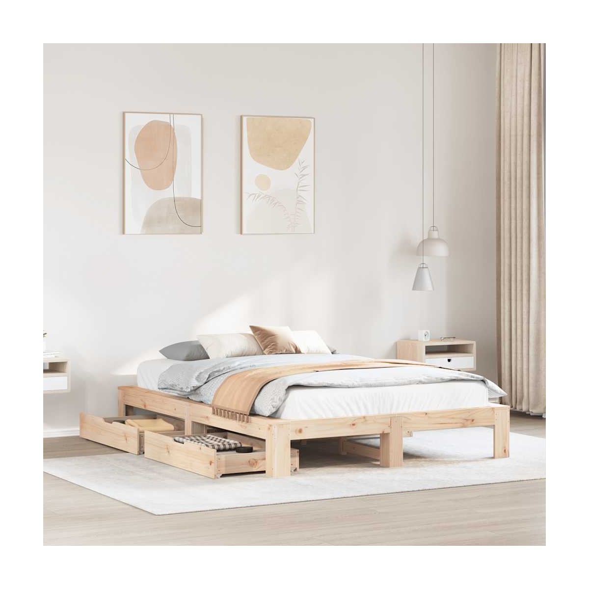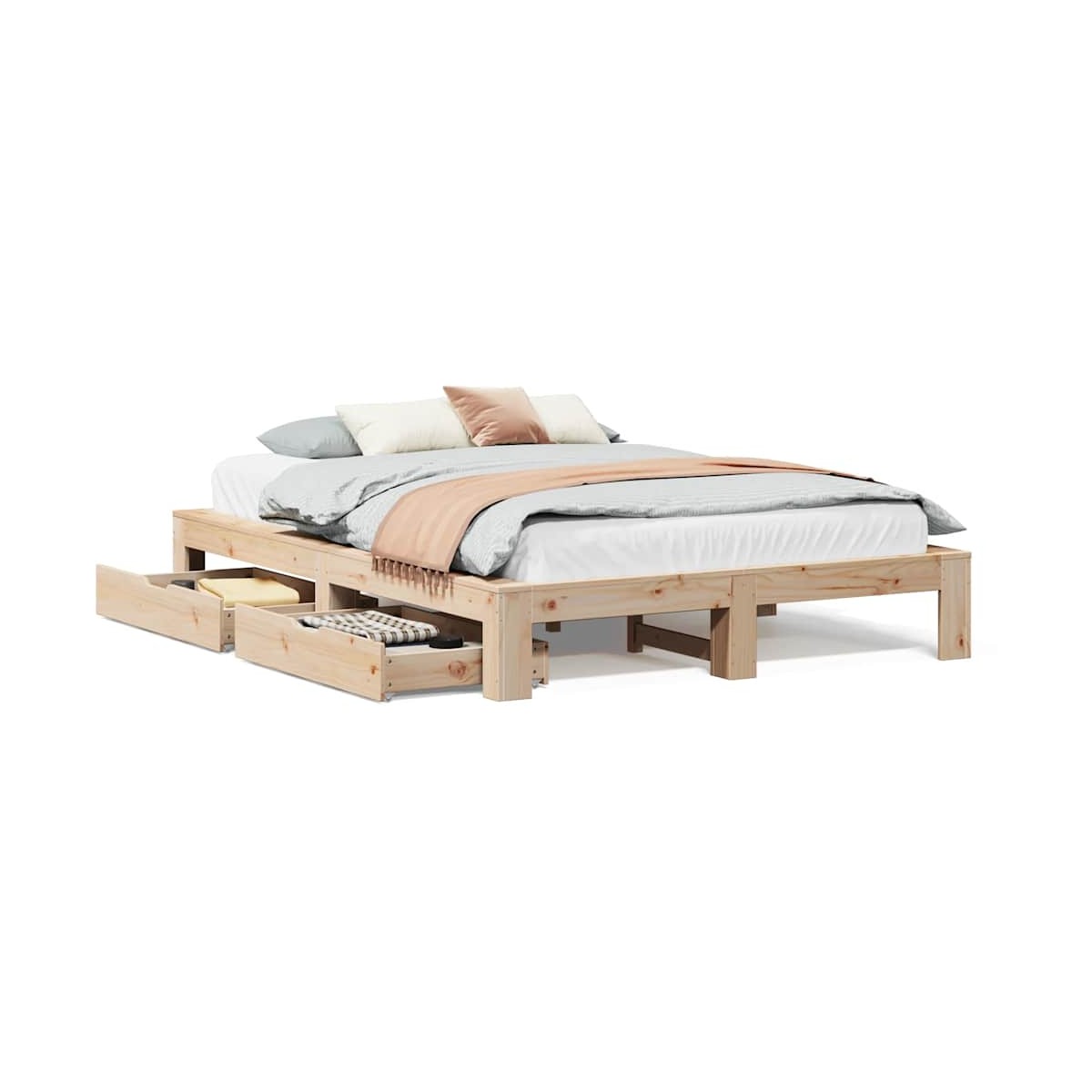 Consigue un sueño más reparador con esta estructura de cama. Es un aporte acogedor para cualquier dormitorio. Estructura estable y duradera: La madera de pino maciza es conocida por su resistencia y durabilidad. Sus vetas rectas y sus característicos nudos contribuyen a su encanto rústico.Somier de láminas para un soporte óptimo: La estructura de cama está equipada con un somier de láminas para el apoyo y la transpirabilidad del colchón.Aproveche al máximo el espacio: Esta base de cama cuenta con dos cajones debajo, que proporcionan almacenamiento para artículos como ropa de cama extra, ropa de temporada y juguetes.Patas estables y duraderas: Esta estructura de cama de madera está sostenida por patas resistentes, lo que garantiza estabilidad, seguridad y firmeza.Maniobrabilidad sin esfuerzo: Este cajón de almacenamiento bajo la cama cuenta con cuatro ruedas, que proporcionan una maniobrabilidad suave y sin esfuerzo para deslizarse dentro y fuera de debajo de tu cama. Información útil:El colchón no está incluido con la cama. Disponemos de una variada selección de colchones. Puedes echar un vistazo a nuestra tienda para buscar el colchón correspondiente.