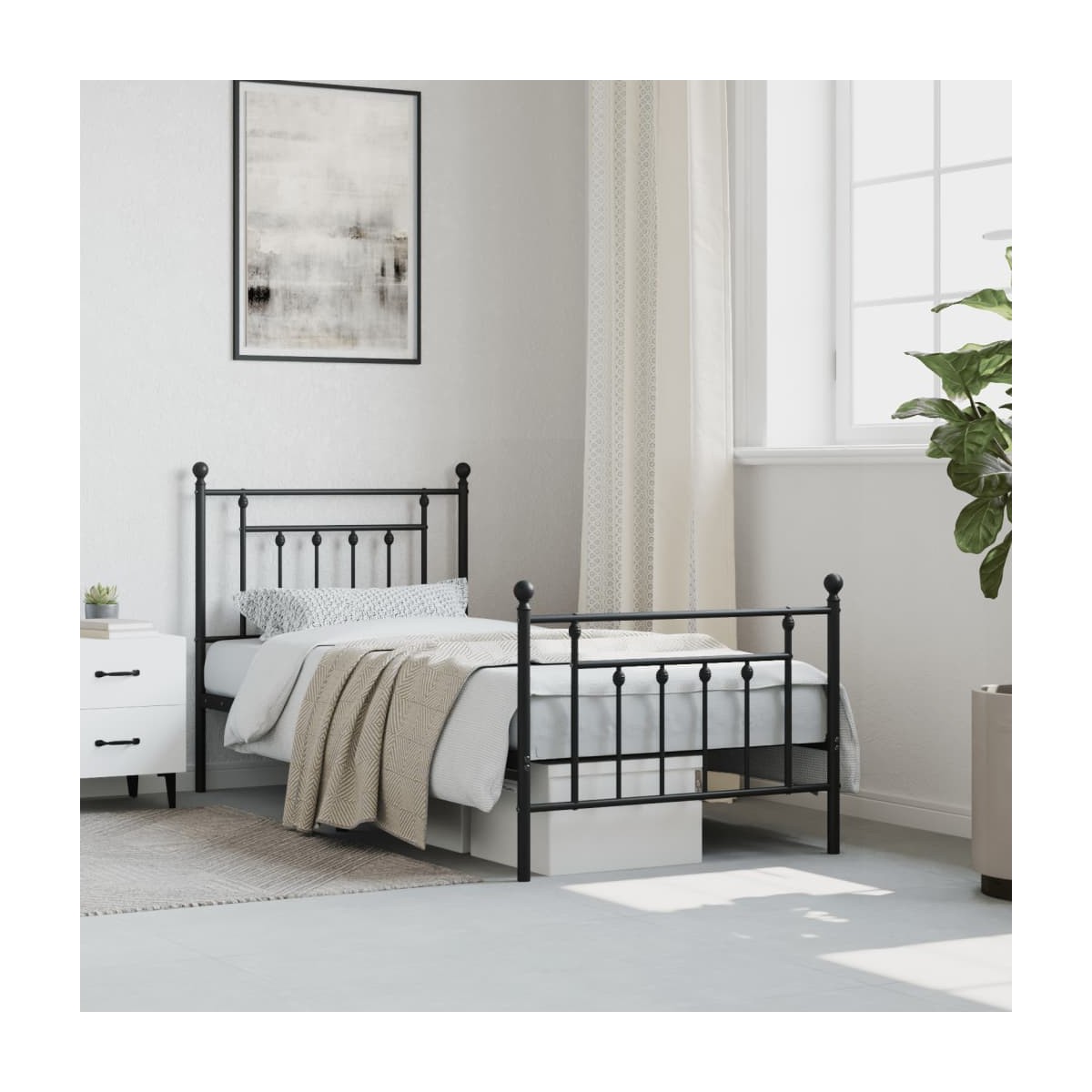 Si estás buscando una estructura de cama robusta para el dormitorio, ¡esta clásica estructura de cama con un diseño elegante y atemporal es la elección perfecta para ti! Construcción robusta de metal: La estructura de la cama está hecha de acero con recubrimiento en polvo. El acero es un material muy duro y fuerte, que ofrece una solidez y estabilidad excepcionales.Listones y patas de metal: La estructura metálica de la cama se completa con patas centrales y listones de metal con el fin de ofrecer al colchón el soporte y la transpirabilidad que tanto necesita.Espacio de almacenamiento adicional: Para mayor comodidad, la cama de invitados también dispone de un espacio debajo para guardar las cajas de almacenaje y que no se vean.Cabecero y estribo de cama funcionales: El cabecero y el estribo de cama mantienen el colchón en su lugar. Además, la cabecera te brinda un excelente soporte para la espalda mientras estás sentado leyendo o mirando la televisión. Información útil:El colchón no está incluido con la cama. Disponemos de una variada selección de colchones. Puedes echar un vistazo a nuestra tienda para buscar el colchón correspondiente.