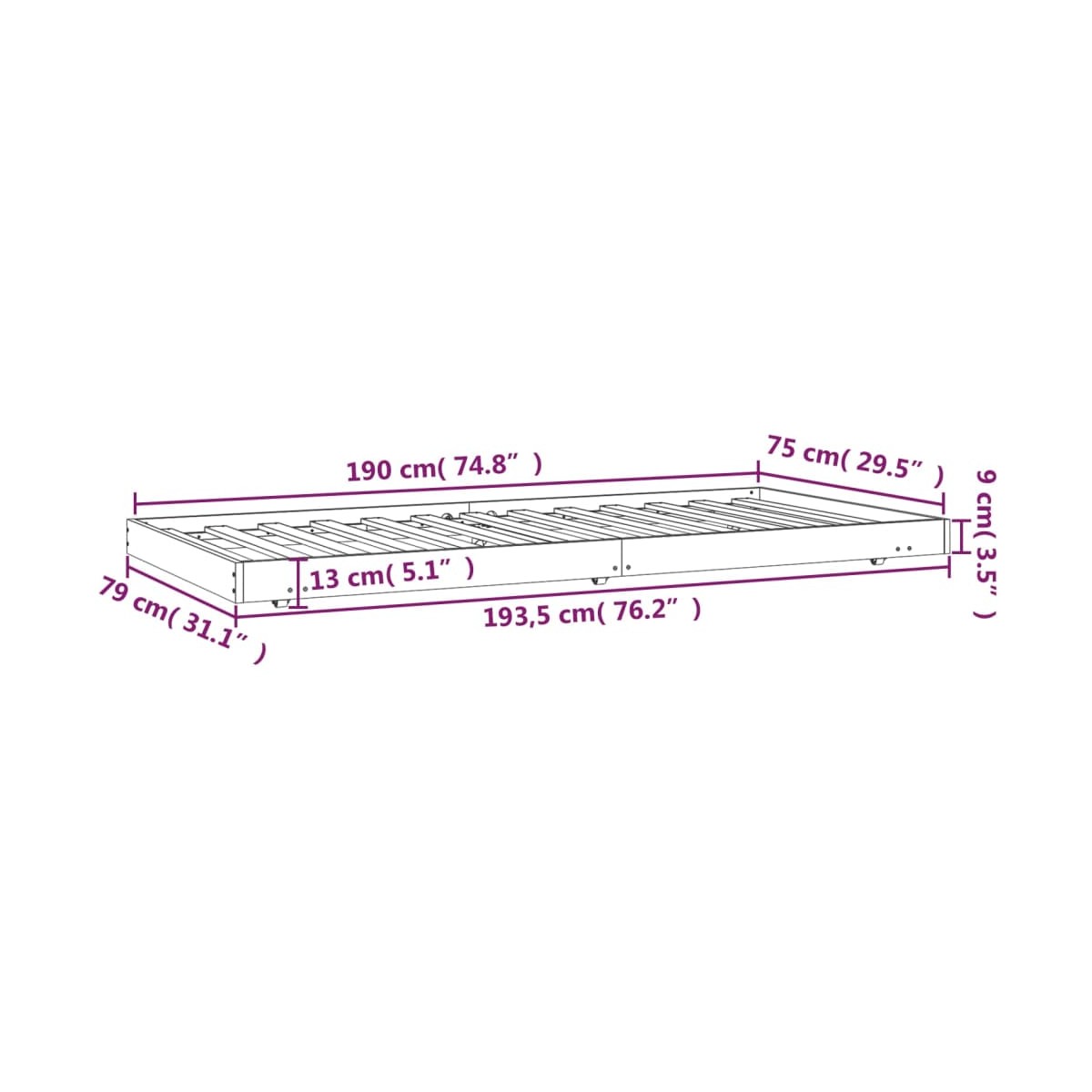 Esta estructura de cama de madera, con un diseño sencillo y atemporal, está destinado a ser un aporte práctico y decorativo para el dormitorio. Madera de pino maciza: La madera de pino maciza es un bonito material natural. La madera de pino tiene vetas rectas, y los nudos dan al material su distintivo aspecto rústico.Estructura de cama estable: La estructura de madera de la cama garantiza su solidez y estabilidad.Listones robustos: Los listones de madera contrachapada proporcionan una buena distribución del peso, lo que garantiza que el colchón se mantenga en tu sitio con cada giro y vuelta del cuerpo mientras duermes.Prácticas ruedas: Esta estructura de cama con ruedas es fácil de mover y ofrece un cómodo lugar para los invitados que se quedan a dormir. Nota:La entrega incluye solo una estructura de cama. El colchón no está incluido. Puedes echar un vistazo en nuestra tienda para buscar colchones a juego.Esta estructura de cama es adecuada para un colchón de 75 x 190 cm.Cada producto viene con un manual de montaje en la caja para facilitar el montaje.