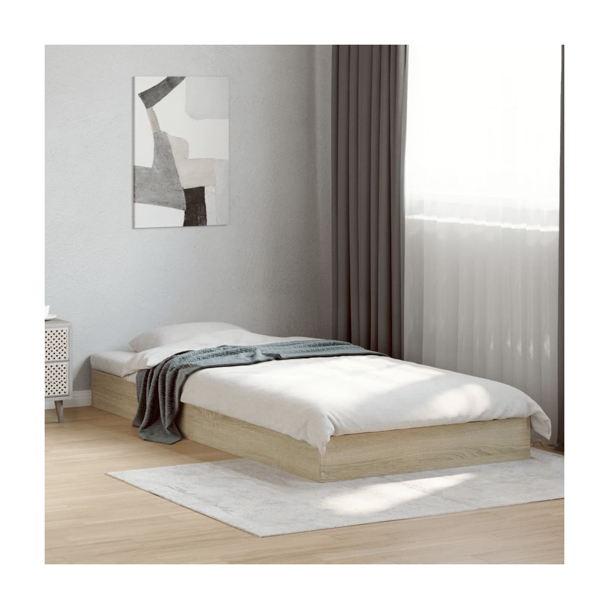 Consigue un sueño más reparador con esta estructura de cama. Es un aporte acogedor para cualquier dormitorio. Material duradero: La madera de ingeniería tiene una calidad excepcional, con una superficie lisa y también cuenta con fuerza, estabilidad y resistencia a la humedad. Listones robustos: Los listones de madera contrachapada proporcionan una buena distribución del peso, lo que garantiza que el colchón se mantenga en tu sitio con cada giro y vuelta del cuerpo mientras duermes. Diseño moderno: ¡Da un estilo moderno a tu casa! El moderno diseño posee líneas limpias, aspectos minimalistas y luz natural como parte del estilo de interiorismo. Información útil:El colchón no está incluido con la cama. Disponemos de una variada selección de colchones. Puedes echar un vistazo a nuestra tienda para buscar el colchón correspondiente.