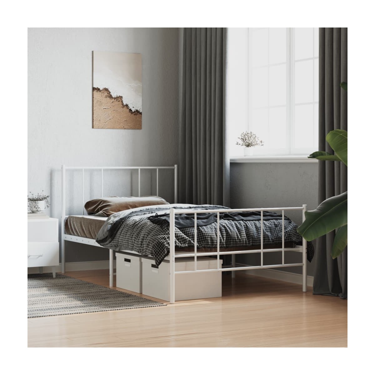 Si estás buscando una estructura de cama robusta para el dormitorio, ¡esta clásica estructura de cama con un diseño elegante y atemporal es la elección perfecta para ti! Construcción robusta de metal: La estructura de la cama está hecha de acero con recubrimiento en polvo. El acero es un material muy duro y fuerte, que ofrece una solidez y estabilidad excepcionales.Listones y patas de metal: La estructura metálica de la cama se completa con patas centrales y listones de metal con el fin de ofrecer al colchón el soporte y la transpirabilidad que tanto necesita.Espacio de almacenamiento adicional: Para mayor comodidad, la cama de invitados también dispone de un espacio debajo para guardar las cajas de almacenaje y que no se vean.Excelente apoyo: El cabecero de la cama te ofrece un excelente soporte para la espalda mientras estás sentado en la cama leyendo o mirando televisión. Información útil:El colchón no está incluido con la cama. Ofrecemos una variada selección de colchones. Puedes echar un vistazo a nuestra tienda para buscar el colchón correspondiente.
