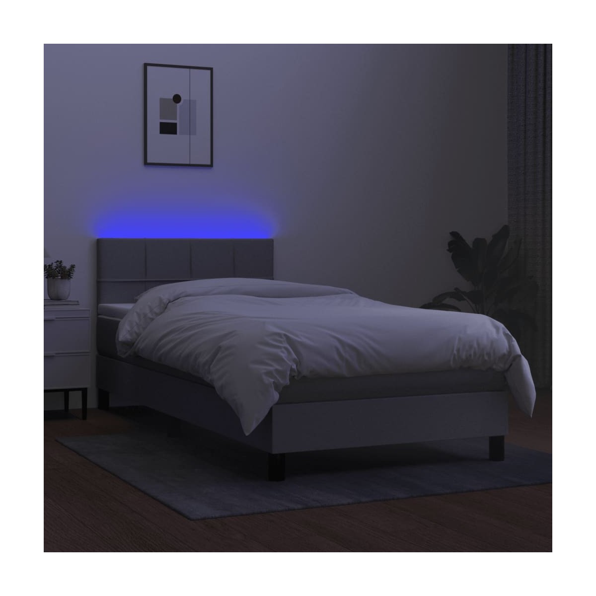 Utiliza esta cama tipo box spring con colchón y luces LED para disfrutar de un sueño reparador. Será el centro de atención del dormitorio. Material de primera calidad: La tela posee un aspecto sencillo y limpio, y es transpirable y duradera.Cabecero práctico: El cabecero de la cama es ajustable en altura según tus preferencias. El cabecero de la cama te proporciona un excelente apoyo para la espalda mientras estás sentado en la cama para leer o ver la televisión.Tira de LED de colores: Alegra la oscuridad con luces LED de colores.Colchón de muelles ensacados: El muelle ensacado individual incorporado es conocido por su altísima calidad, al tiempo que garantiza un alto nivel de durabilidad y adaptabilidad. Puede absorber eficazmente el ruido y los golpes causados por los lanzamientos y los giros.Protector de colchón respetuoso con la piel: El protector de colchón tiene una funda de tejido resistente y respetuoso con la piel, que lo hace suave y confortable. Nota: La lona impermeable no está incluidaPor razones de higiene, el colchón no puede devolverse si se ha quitado o abierto el embalaje.Cada producto viene con un manual de montaje en la caja para facilitar el montaje.Únicamente puedes cortar por la parte con el símbolo de las tijeras y únicamente la parte con el USB seguirá funcionando como antes.El producto tiene un conector USB, pero no se incluye la fuente de alimentación USB de 5 V certificada.