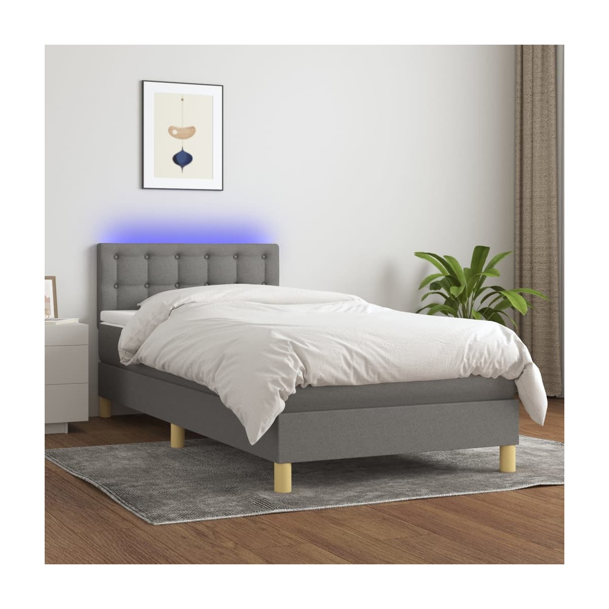 Utiliza esta cama box spring con colchón y LED para disfrutar de un sueño reparador. Es el centro de atención de tu dormitorio. Material de primera calidad: La tela posee un aspecto sencillo y limpio, y es transpirable y duradera.Cabecero práctico: El cabecero de la cama es ajustable en altura según tus preferencias. El cabecero de la cama te proporciona un excelente apoyo para la espalda mientras estás sentado en la cama para leer o ver la televisión.Tira de LED de colores: Alegra la oscuridad con luces LED de colores.Colchón de muelles ensacados: El muelle ensacado individual incorporado es conocido por su altísima calidad, al tiempo que garantiza un alto nivel de durabilidad y adaptabilidad. Puede absorber eficazmente el ruido y los golpes causados por los lanzamientos y los giros.Protector de colchón respetuoso con la piel: El protector de colchón tiene una funda de tejido resistente y respetuoso con la piel, que lo hace suave y confortable. Nota:Por razones de higiene, el colchón no puede devolverse si se ha quitado o abierto el embalaje.Cada producto viene con un manual de montaje en la caja para facilitar el montaje.Únicamente puedes cortar por la parte con el símbolo de las tijeras y únicamente la parte con el USB seguirá funcionando como antes.El producto tiene un conector USB, pero no se incluye la fuente de alimentación USB de 5 V certificada.