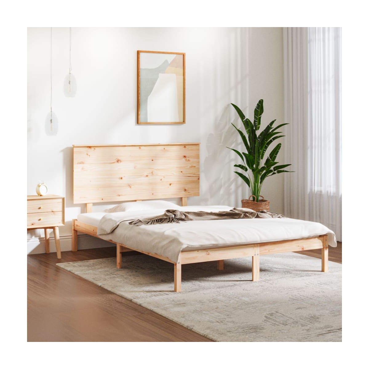 ¡Lleva la ruta moderna a tu dormitorio con esta estructura de cama de madera! Es un aporte práctico y decorativo para tu hogar. Madera de pino maciza: La madera de pino maciza es un bonito material natural. La madera de pino tiene vetas rectas, y los nudos dan al material su distintivo aspecto rústico.Listones robustos: Los listones de madera contrachapada proporcionan una buena distribución del peso, lo que garantiza que el colchón se mantenga en tu sitio con cada giro y vuelta del cuerpo mientras duermes.Cabecero cómodo: El clásico cabecero te permite descansar cómodamente mientras lees o ves una película. Nota:La entrega incluye solo una estructura de cama. El colchón no está incluido. Puedes echar un vistazo en nuestra tienda para buscar colchones a juego.Esta estructura de cama es adecuada para un colchón de 140 x 200 cm