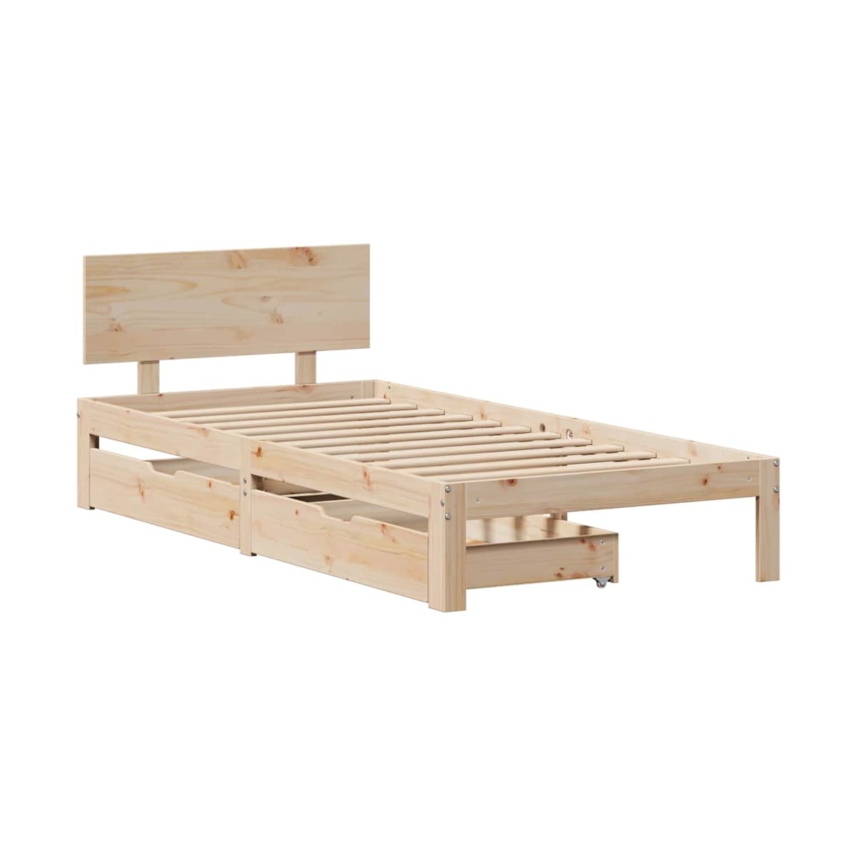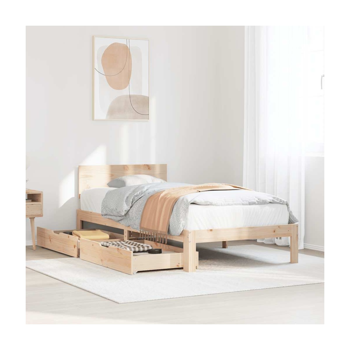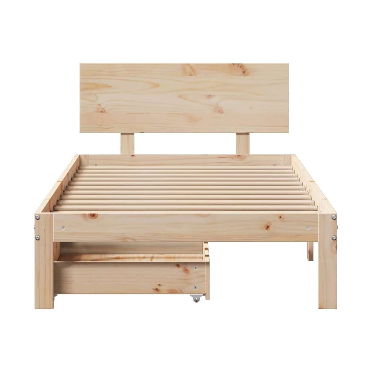 Consigue un sueño más reparador con esta estructura de cama. Es un aporte acogedor para cualquier dormitorio. Estructura estable y duradera: La madera de pino maciza es conocida por su resistencia y durabilidad. Sus vetas rectas y sus característicos nudos contribuyen a su encanto rústico.Somier de láminas para un soporte óptimo: La estructura de cama está equipada con un somier de láminas para el apoyo y la transpirabilidad del colchón.Espacio de almacenamiento extra: Esta base de cama cuenta con dos cajones debajo, lo que proporciona almacenamiento para artículos como ropa de cama, ropa de temporada y juguetes.Cabecero versátil: Este somier viene con un cabecero que proporciona un excelente soporte para la espalda cuando te sientas en la cama para leer o ver la televisión, a la vez que sirve como elemento decorativo.Maniobrabilidad sin esfuerzo: Este cajón de almacenamiento bajo la cama cuenta con cuatro ruedas, que proporcionan una maniobrabilidad suave y sin esfuerzo para deslizarse dentro y fuera de debajo de tu cama. Información útil:El colchón no está incluido con la cama. Disponemos de una variada selección de colchones. Puedes echar un vistazo a nuestra tienda para buscar el colchón correspondiente.