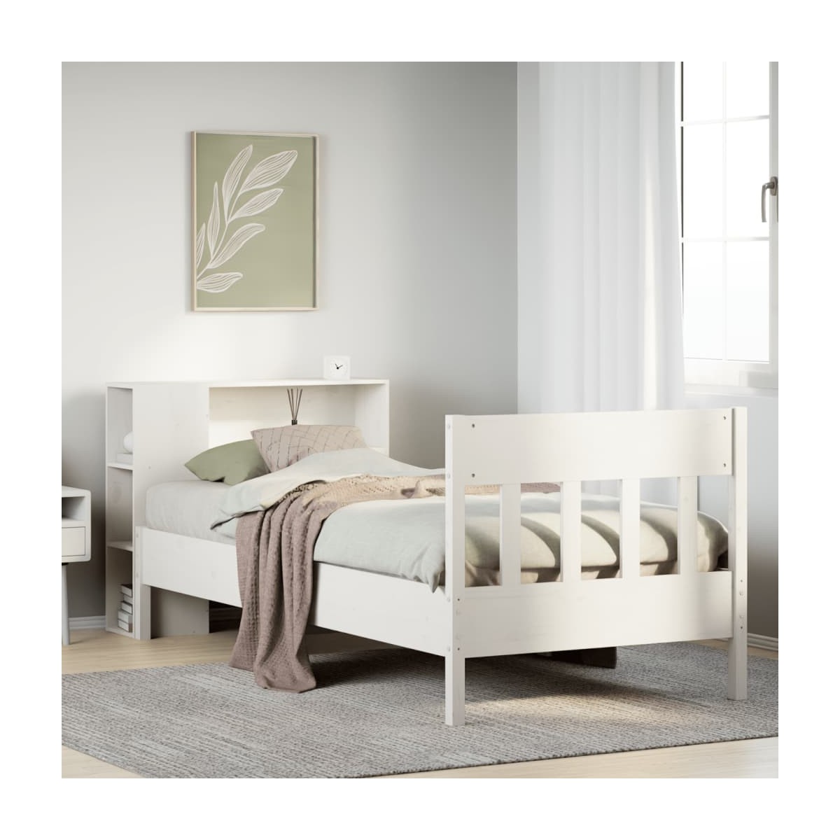 ¡Consigue una mejor noche de sueño reparador con esta cama con estantería! Es un aporte acogedor para cualquier dormitorio. Estructura estable y duradera: La madera de pino maciza es conocida por su resistencia y durabilidad. Sus vetas rectas y sus característicos nudos contribuyen a su encanto rústico. Somier de láminas para un soporte óptimo: La estructura de cama está equipada con un somier de láminas para el apoyo y la transpirabilidad del colchón. Amplio espacio de almacenamiento: El cabecero de estantería ofrece un amplio espacio de almacenamiento para mantener libros, artículos decorativos o pertenencias personales al alcance de la mano, lo que reduce el desorden en el dormitorio. Práctico pie de cama: El pie de cama no solo contribuye a la estabilidad general del marco de la cama, proporcionando un entorno seguro para dormir, sino que también asegura su colchón en su lugar y evita que las mantas, sábanas y otra ropa de cama se caigan del extremo de la cama, manteniendo una apariencia ordenada. Ahorro de espacio: Este cabecero es una opción de ahorro de espacio que puede sustituir la necesidad de una mesilla de noche, ayudando a maximizar el espacio de tu dormitorio, y haciéndolo ideal para espacios pequeños o limitados. Información útil:El colchón no está incluido con la cama. Disponemos de una variada selección de colchones. Puedes echar un vistazo a nuestra tienda para buscar el colchón correspondiente.