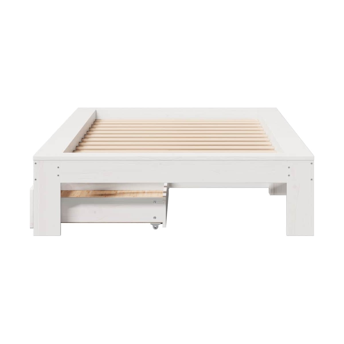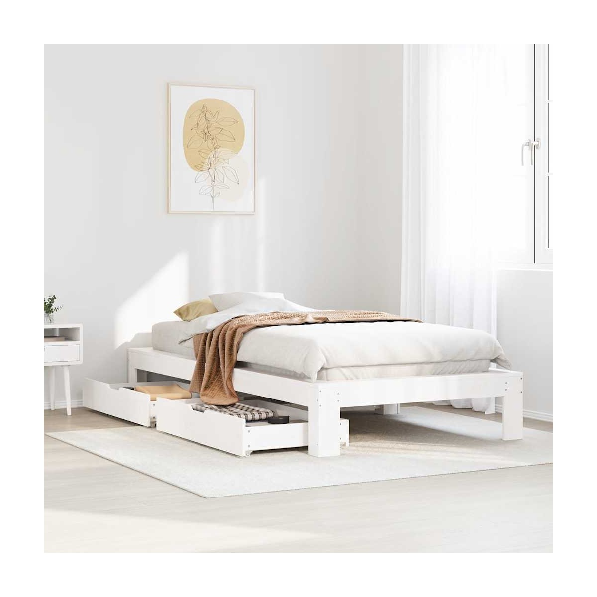 Consigue un sueño más reparador con esta estructura de cama. Es un aporte acogedor para cualquier dormitorio. Estructura estable y duradera: La madera de pino maciza es conocida por su resistencia y durabilidad. Sus vetas rectas y sus característicos nudos contribuyen a su encanto rústico.Somier de láminas para un soporte óptimo: La estructura de cama está equipada con un somier de láminas para el apoyo y la transpirabilidad del colchón.Aproveche al máximo el espacio: Esta base de cama cuenta con dos cajones debajo, que proporcionan almacenamiento para artículos como ropa de cama extra, ropa de temporada y juguetes.Patas estables y duraderas: Esta estructura de cama de madera está sostenida por patas resistentes, lo que garantiza estabilidad, seguridad y firmeza.Maniobrabilidad sin esfuerzo: Este cajón de almacenamiento bajo la cama cuenta con cuatro ruedas, que proporcionan una maniobrabilidad suave y sin esfuerzo para deslizarse dentro y fuera de debajo de tu cama. Información útil:El colchón no está incluido con la cama. Disponemos de una variada selección de colchones. Puedes echar un vistazo a nuestra tienda para buscar el colchón correspondiente.