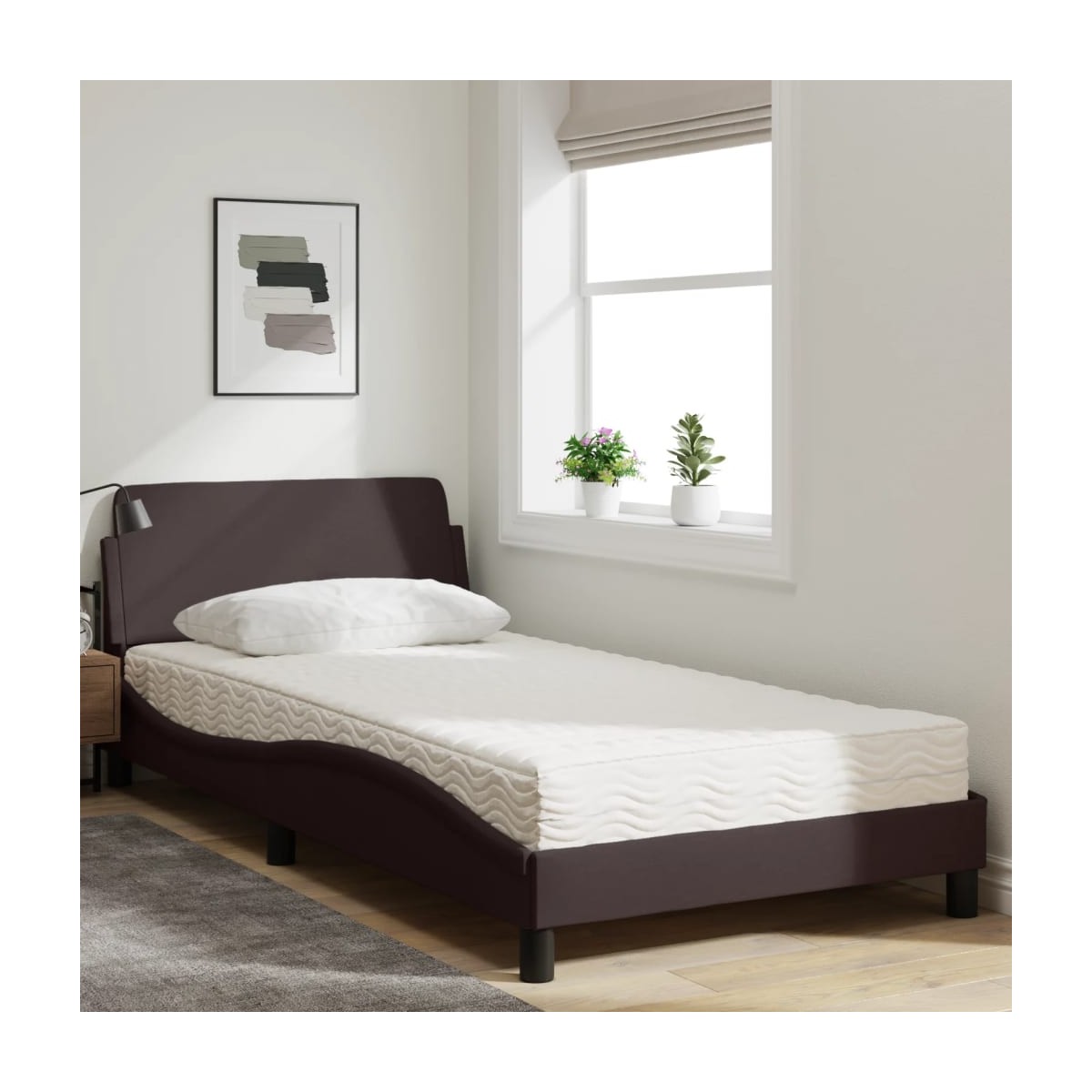 ¡Consigue tener un sueño más reparador en esta cama con colchón! Es un aporte acogedor para cualquier dormitorio. Material de primera calidad: La tela posee un aspecto sencillo y limpio, y es transpirable y duradera.Listones robustos: Los listones de madera contrachapada proporcionan una buena distribución del peso, lo que garantiza que el colchón se mantenga en tu sitio con cada giro y vuelta del cuerpo mientras duermes.Excelente apoyo: El cabecero de la cama te proporciona un excelente apoyo para la espalda mientras estás sentado en la cama para leer o ver la televisión.Colchón de espuma: Este colchón de cama de tela de 3 capas está relleno de espuma de PU 22D para ofrecer un confort óptimo. Alivia el cansancio y favorece la circulación sanguínea, con el fin de ofrecerte una relajación completa y una buena calidad de sueño. Además, el colchón está disponible en dureza H2 y H3, por lo que solo tienes que girarlo para elegir la dureza que más te convenga.Diseño lateral ondulado: El look ondulado de la estructura de la cama es elegante y sofisticado, agregando un toque moderno y elegante a tu decoración, convirtiéndolo en el foco de atención de tu dormitorio.