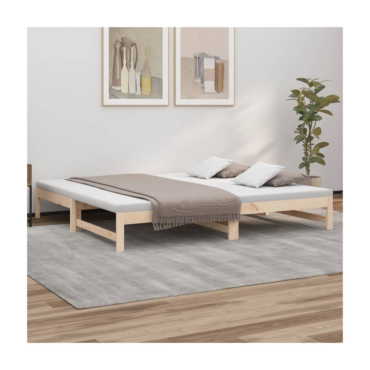 Este versátil sofá cama de madera se puede usar como cama en el dormitorio y también encaja a la perfección como sofá en el salón. Madera maciza de pino: La madera maciza de pino es un bonito material natural. La madera de pino tiene vetas rectas, y los nudos dan al material su distintivo aspecto rústico. Esta cama para invitados está hecha de madera maciza de pino, más estable y duradera.Sofá cama extraíble: Este sofá cama de madera se puede utilizar como sofá durante el día o como cama por la noche. Es una solución rápida para alojar invitados por la noche sin ocupar mucho espacio.Diseño de láminas: El somier de láminas proporciona una mejor circulación del aire para mantener el colchón fresco durante más tiempo, y mejora así la capacidad de peso de la cama auxiliar y asegura su estabilidad.Uso sencillo: Este sofá cama resulta muy práctico de usar y no necesita un canapé ni una base. ¡Tan solo coloca el colchón encima y disfruta de un sueño reparador o descansa sentado! Nota:Ten en cuenta que la entrega incluye únicamente una estructura de cama. El colchón no está incluido. Puedes echar un vistazo a nuestra tienda para buscar el correspondiente colchón.Cada producto viene con un manual de montaje en la caja para facilitar el montaje.