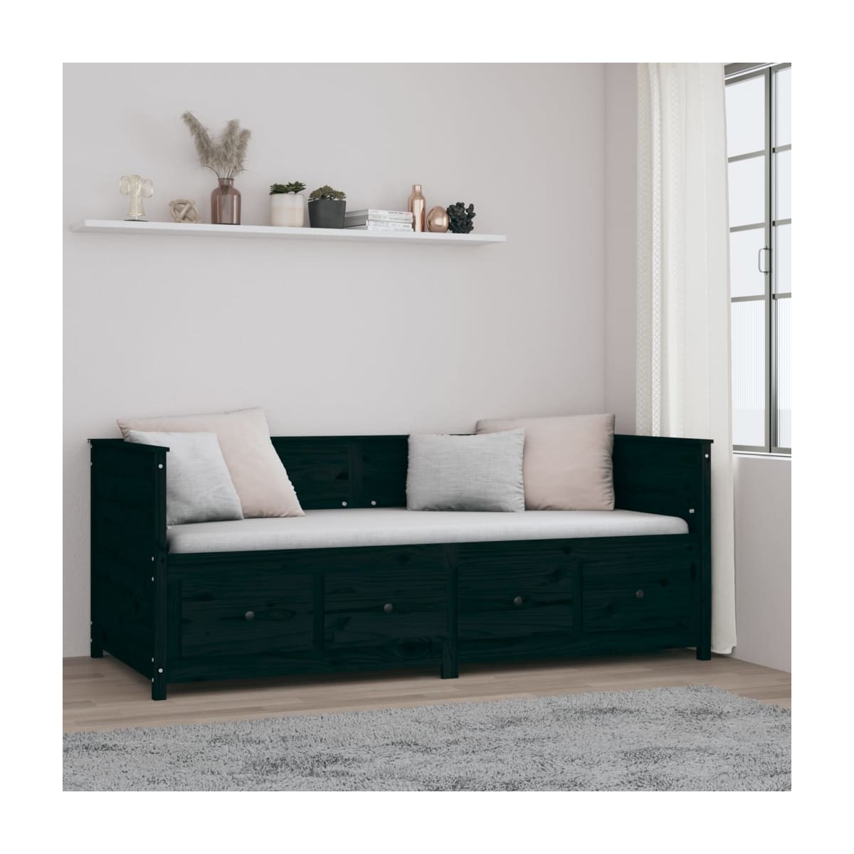Este sofá cama de madera será perfecto para acomodar a invitados inesperados durante la noche mientras brinda un cómodo espacio para sentarse durante el día. Madera de pino maciza: La madera de pino maciza es un bonito material natural. La madera de pino tiene vetas rectas, y los nudos dan al material su distintivo aspecto rústico. Diseño multiusos: Este sofá cama de madera se puede utilizar como sofá durante el día o como cama por la noche. Es una solución rápida para alojar invitados por la noche sin ocupar mucho espacio.Amplio espacio de almacenaje: Equipada con cajones, esta base de cama te permite tener las cosas bien organizadas y protegerlas del polvo en espacios reducidos. Nota:La entrega incluye únicamente un sofá cama. El colchón no está incluido. Puedes echar un vistazo a nuestra tienda para buscar el correspondiente colchón.Cada producto viene con un manual de montaje en la caja para facilitar el montaje.