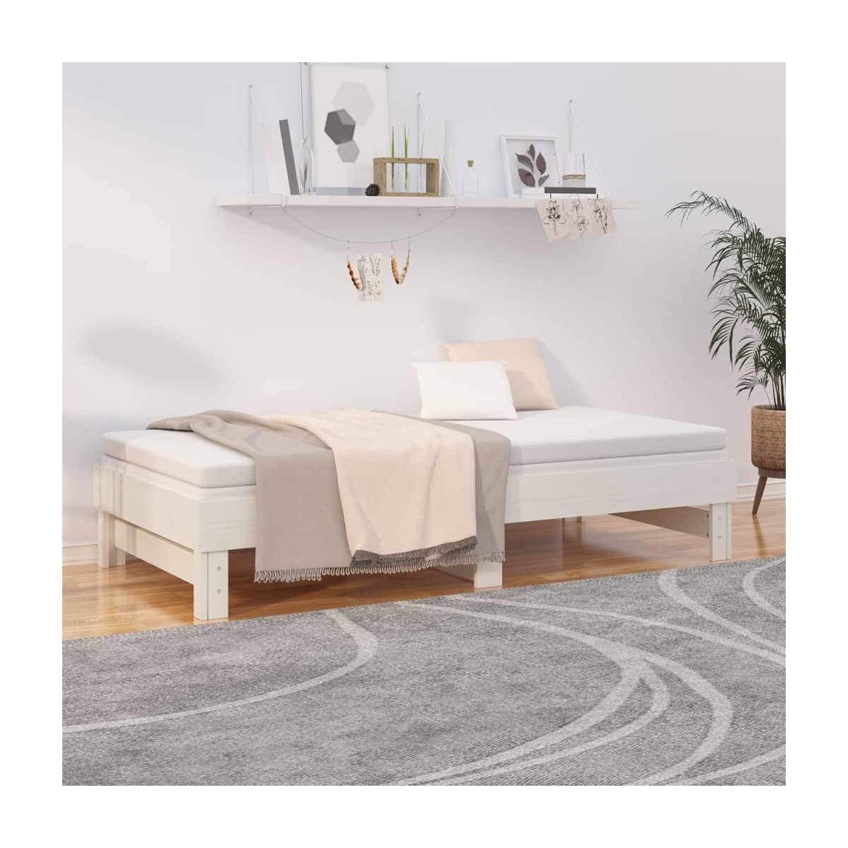 Este versátil sofá cama de madera se puede usar como cama en el dormitorio y también encaja a la perfección como sofá en el salón. Madera maciza de pino: La madera maciza de pino es un bonito material natural. La madera de pino tiene vetas rectas, y los nudos dan al material su distintivo aspecto rústico. Esta cama para invitados está hecha de madera maciza de pino, más estable y duradera.Sofá cama extraíble: Este sofá cama de madera se puede utilizar como sofá durante el día o como cama por la noche. Es una solución rápida para alojar invitados por la noche sin ocupar mucho espacio.Diseño de láminas: El somier de láminas proporciona una mejor circulación del aire para mantener el colchón fresco durante más tiempo, y mejora así la capacidad de peso de la cama auxiliar y asegura su estabilidad.Uso sencillo: Este sofá cama resulta muy práctico de usar y no necesita un canapé ni una base. ¡Tan solo coloca el colchón encima y disfruta de un sueño reparador o descansa sentado! Nota:Ten en cuenta que la entrega incluye únicamente una estructura de cama. El colchón no está incluido. Puedes echar un vistazo a nuestra tienda para buscar el correspondiente colchón.Cada producto viene con un manual de montaje en la caja para facilitar el montaje.