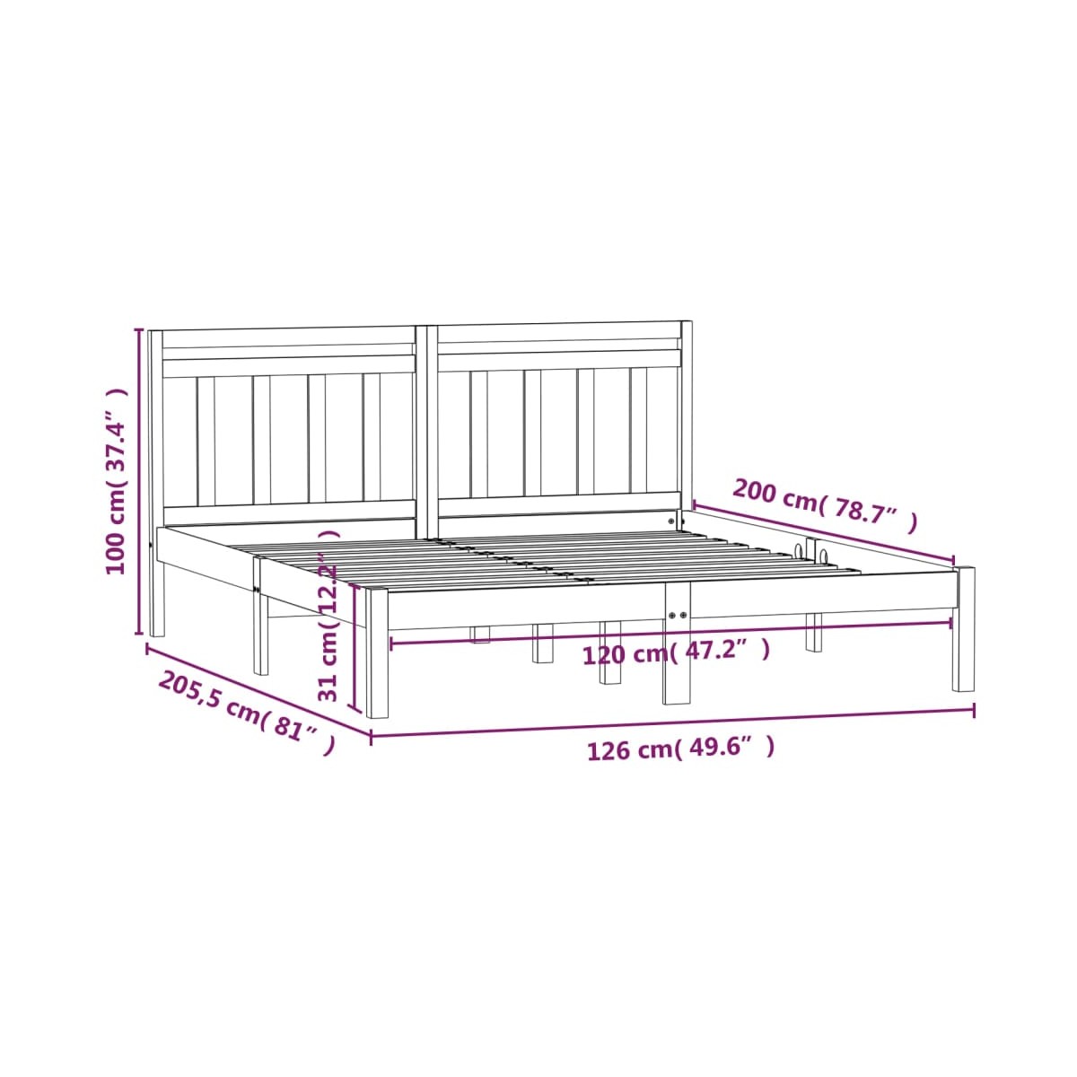 - Dimensiones totales de la estructura de cama: 205,5 x 146 x 100 cm (largo x ancho x alto)