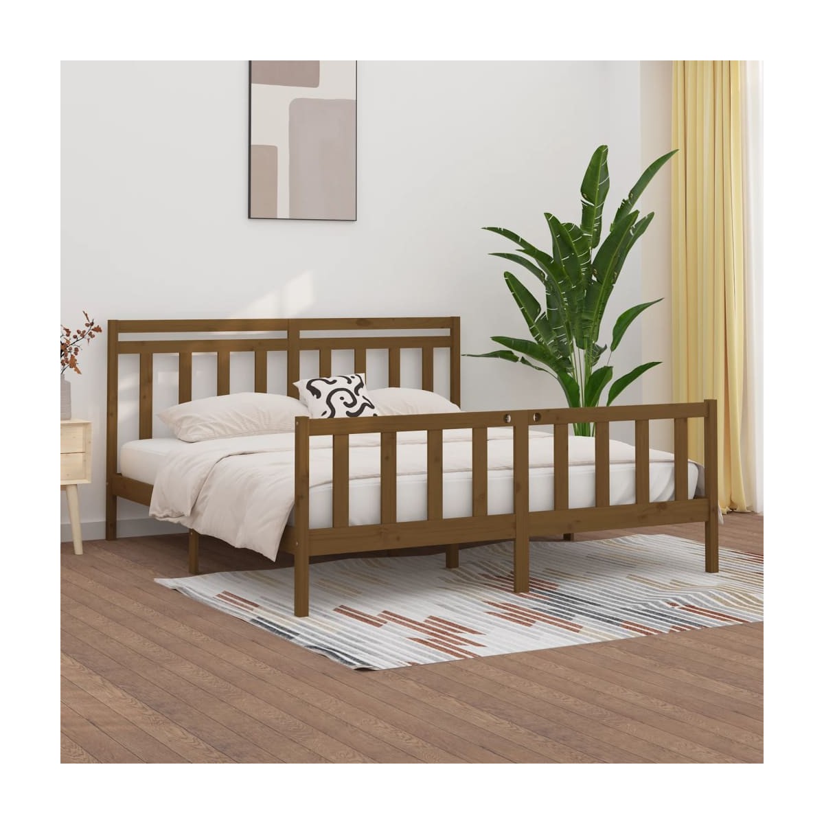 ¡Disfruta de una buena noche de sueño en esta estructura cama de madera! Es un aporte práctico y decorativo para tu decoración. Madera de pino maciza: La madera de pino maciza es un bonito material natural. La madera de pino tiene vetas rectas, y los nudos dan al material su distintivo aspecto rústico.Listones robustos: Los listones de madera contrachapada proporcionan una buena distribución del peso, lo que garantiza que el colchón se mantenga en tu sitio con cada giro y vuelta del cuerpo mientras duermes.Cómodo cabecero: El cabecero clásico de esta estructura de cama de madera maciza te permite descansar cómodamente mientras lees o ves una película. Nota:La entrega incluye solo una estructura de cama. El colchón no está incluido. Puedes echar un vistazo en nuestra tienda para buscar colchones a juego.Esta estructura de cama es adecuada para un colchón de 200 x 200 cm