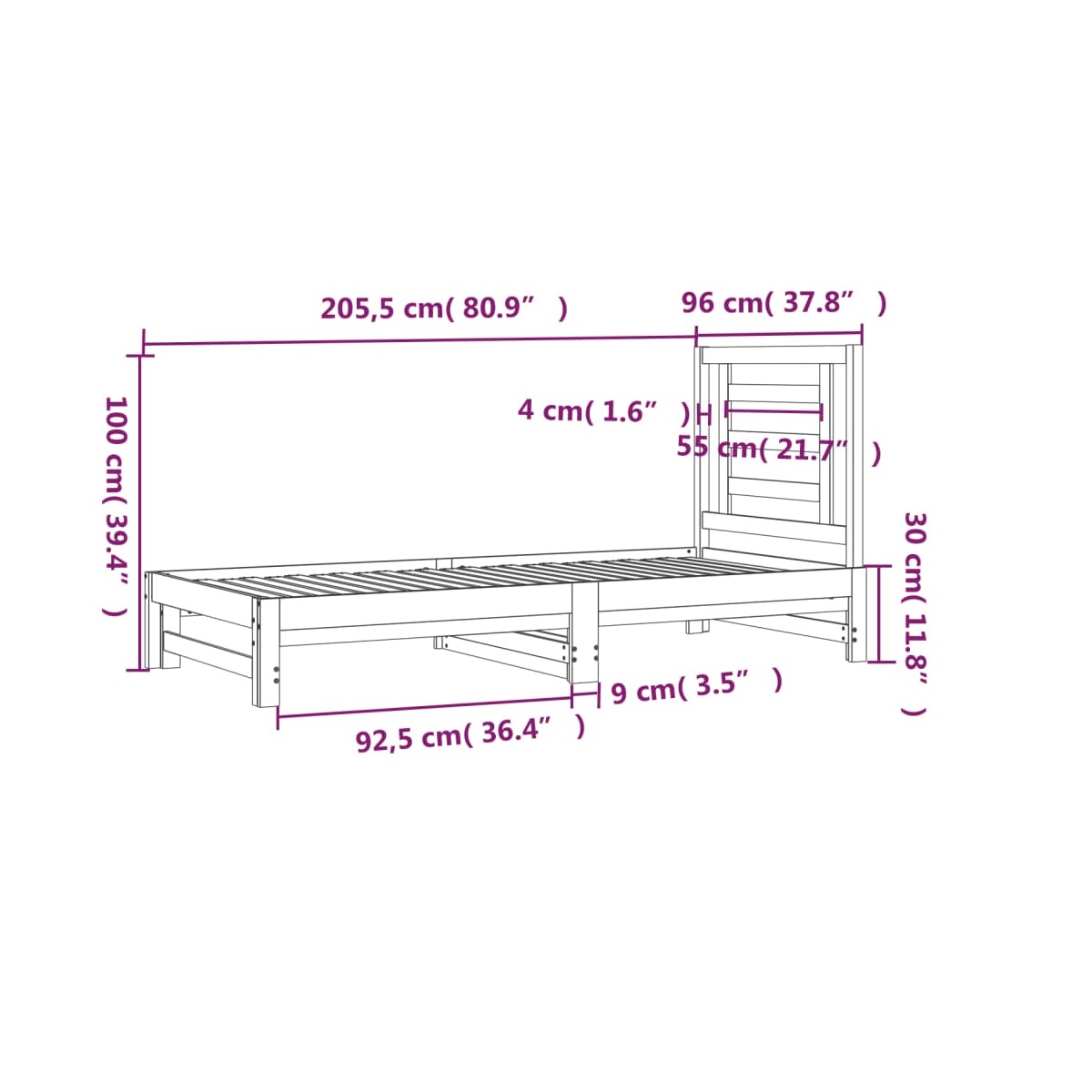 - Dimensiones del sofá cama (sin abrir): 205,5 x 95 x 30 cm (largo x ancho x alto)