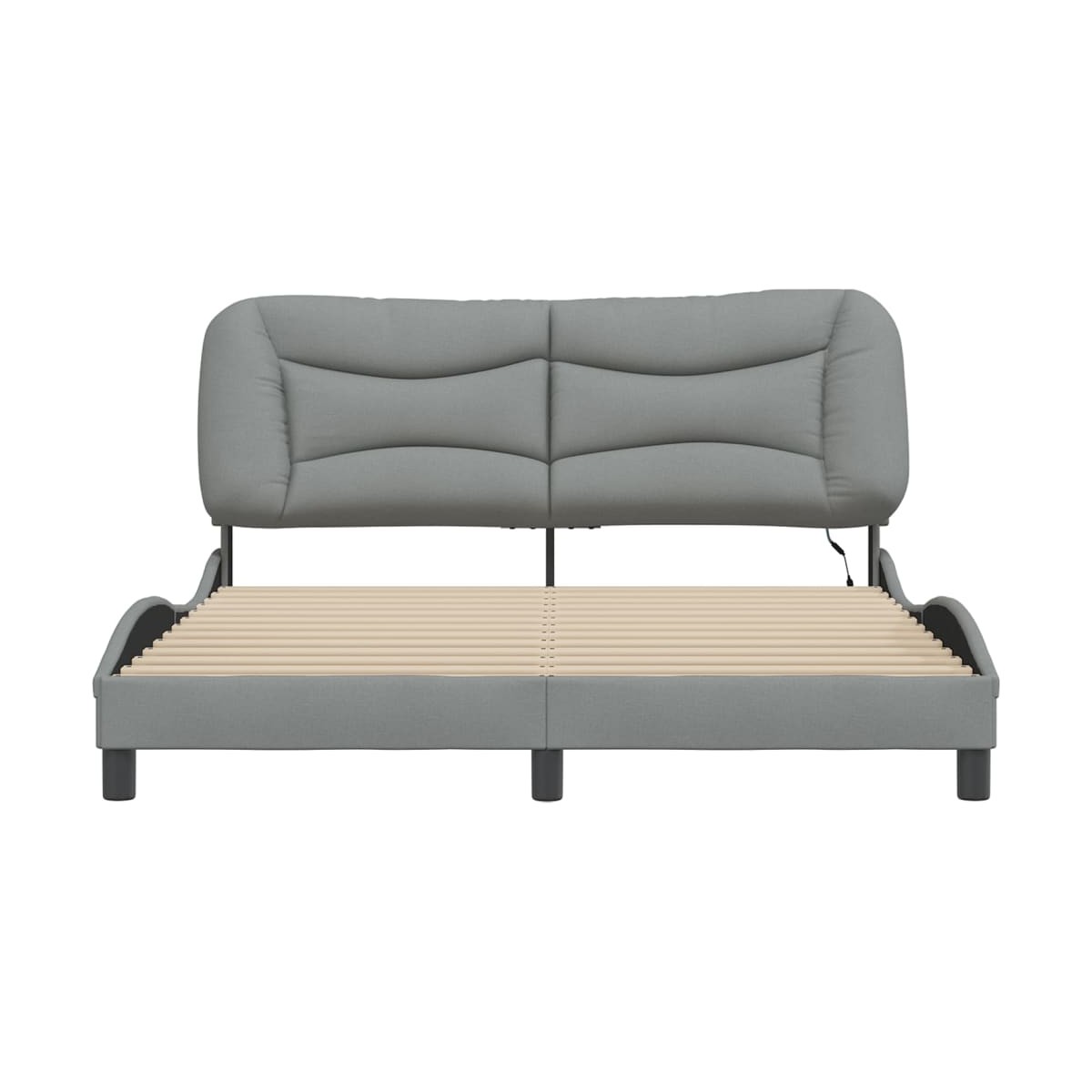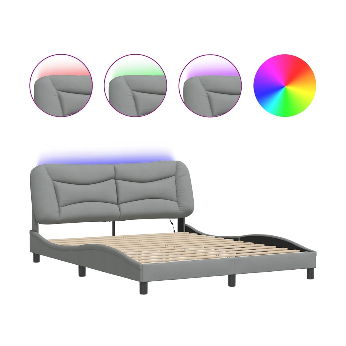 ¡Consigue tener un sueño reparador con esta estructura de cama con luces LED! Es un aporte acogedor para cualquier dormitorio. Material de primera calidad: La tela posee un aspecto sencillo y limpio, y es transpirable y duradera.Listones robustos: Los listones de madera contrachapada proporcionan una buena distribución del peso, lo que garantiza que el colchón se mantenga en tu sitio con cada giro y vuelta del cuerpo mientras duermes.Excelente apoyo: El cabecero de la cama te proporciona un excelente apoyo para la espalda mientras estás sentado en la cama para leer o ver la televisión.Tira de LED de colores: Alegra la oscuridad con luces LED de colores. Los cierres de gancho y bucle de la parte posterior del cojín del cabecero se pueden utilizar para fijar las luces LED.Diseño lateral ondulado: El look ondulado de la estructura de la cama es elegante y sofisticado, agregando un toque moderno y elegante a tu decoración, convirtiéndolo en el foco de atención de tu dormitorio. Información útil:El colchón no está incluido con la cama. Disponemos de una variada selección de colchones. Puedes echar un vistazo a nuestra tienda para buscar el colchón correspondiente.El producto tiene un conector USB que necesita una fuente de alimentación USB certificada de 5 V (no incluida).