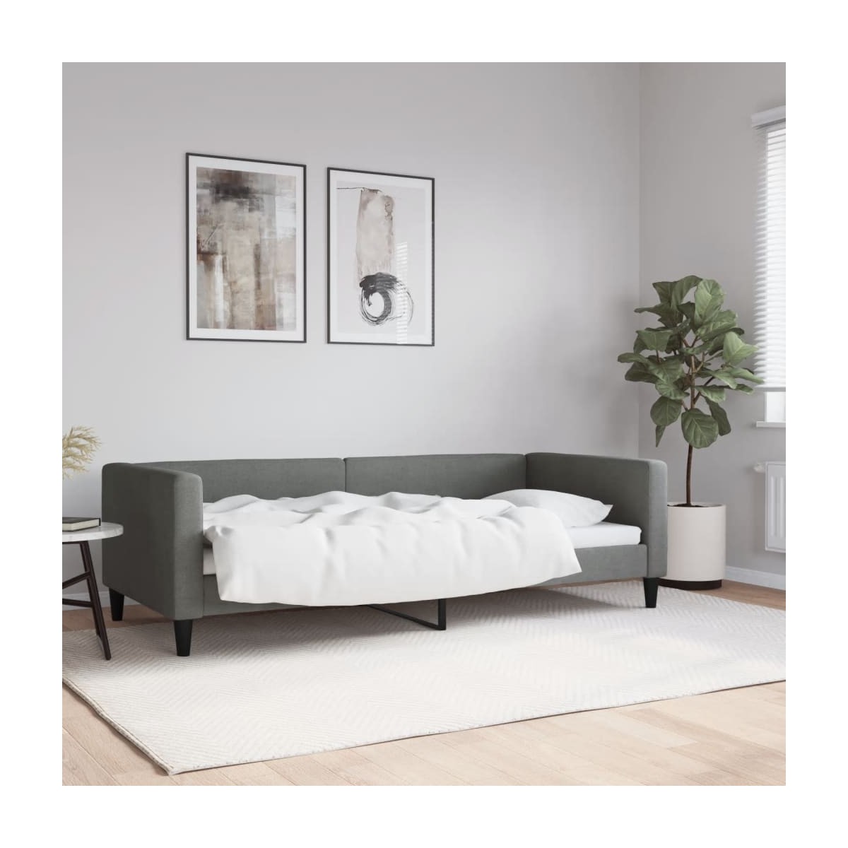 Este sofá cama 2 en 1, que sirve tanto de sofá como de cama, es un complemento práctico y llamativo para el salón o el dormitorio. Sofá cama versátil: El sofá cama puede utilizarse como sofá durante el día o como cama por la noche, para tener una solución rápida para alojar a invitados que pasen la noche.Experiencia confortable: El sofá cama está hecho de tela. La tela posee un aspecto sencillo y limpio, además de ser transpirable y duradera. Asimismo, el respaldo y los reposabrazos de la cama de invitados están acolchados con espuma para mejorar la comodidad.Estructura robusta y estable: La estructura principal del sofá cama está hecha de metal y madera maciza, por lo que es muy resistente y duradero. Estos listones de madera contrachapada permiten una mejor circulación del aire con el fin de mantener el colchón fresco durante más tiempo, además de mejorar la capacidad de peso y garantizar la estabilidad.Diseño moderno: ¡El sofá cama tiene un diseño moderno con líneas nítidas, un aspecto minimalista, así como luz natural, y añadirá un estilo moderno a la casa! Información útil:El colchón no está incluido con la cama. Disponemos de una variada selección de colchones. Puedes echar un vistazo a nuestra tienda para buscar el colchón correspondiente.