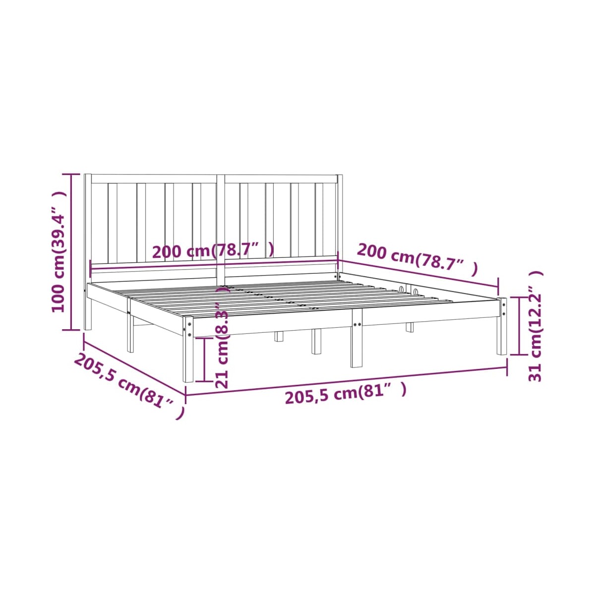 Con un diseño sencillo pero atemporal, esta estructura de cama está pensada para ser un aporte verdaderamente práctico y decorativo para tu dormitorio. Material de primera calidad: La madera maciza de pino es un bonito material natural. La madera de pino tiene vetas rectas, y los nudos dan al material su distintivo aspecto rústico.Estructura de cama resistente: La estructura de madera garantiza su solidez y estabilidad. Las láminas de pino macizo proporcionan soporte adicional para tu cama. Extiende la vida útil del colchón al absorber la mayor parte del estrés y el peso en la cama.Soporte cómodo: Esta cabecera de cama te brinda un excelente soporte para la espalda cuando te sientas en la cama para leer o ver películas. Nota:El colchón no está incluido. Puedes echar un vistazo a nuestra tienda para buscar el correspondiente colchón.Esta estructura de cama es adecuada para un colchón de 200 x 200 cm