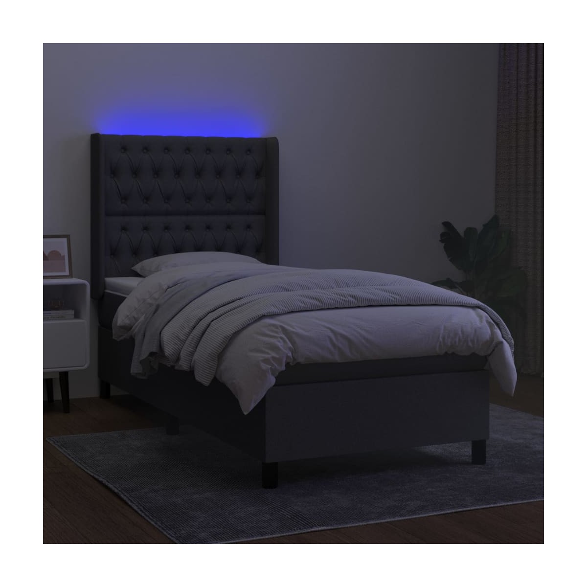 Utiliza esta cama tipo box spring con colchón y luces LED para disfrutar de un sueño reparador. Será el centro de atención del dormitorio. Material de primera calidad: La tela posee un aspecto sencillo y limpio, y es transpirable y duradera.Cabecero práctico: El cabecero de la cama es ajustable en altura según tus preferencias. El cabecero de la cama te proporciona un excelente apoyo para la espalda mientras estás sentado en la cama para leer o ver la televisión.Tira de LED de colores: Alegra la oscuridad con luces LED de colores.Colchón de muelles ensacados: El muelle ensacado individual incorporado es conocido por su altísima calidad, al tiempo que garantiza un alto nivel de durabilidad y adaptabilidad. Puede absorber eficazmente el ruido y los golpes causados por los lanzamientos y los giros.Protector de colchón respetuoso con la piel: El protector de colchón tiene una funda de tejido resistente y respetuoso con la piel, que lo hace suave y confortable. Nota: La lona impermeable no está incluidaPor razones de higiene, el colchón no puede devolverse si se ha quitado o abierto el embalaje.Únicamente puedes cortar por la parte con el símbolo de las tijeras y únicamente la parte con el USB seguirá funcionando como antes.Cada producto viene con un manual de montaje en la caja para facilitar el montaje.El producto tiene un conector USB, pero no se incluye la fuente de alimentación USB de 5 V certificada.