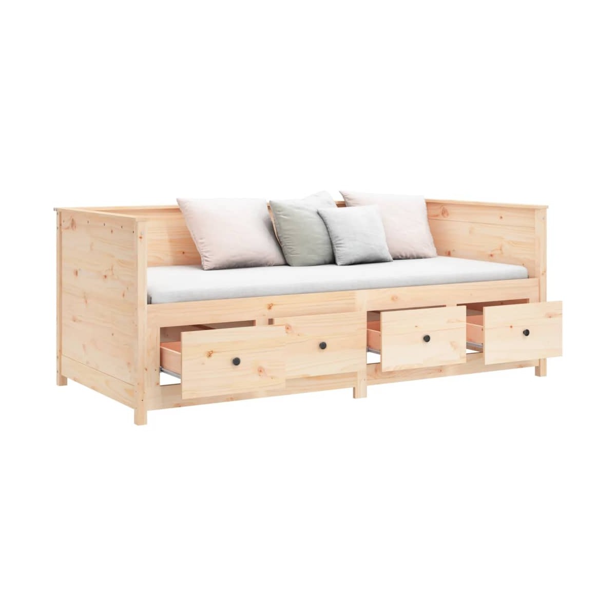 Este sofá cama de madera será perfecto para acomodar a invitados inesperados durante la noche mientras brinda un cómodo espacio para sentarse durante el día. Madera de pino maciza: La madera de pino maciza es un bonito material natural. La madera de pino tiene vetas rectas, y los nudos dan al material su distintivo aspecto rústico. Diseño multiusos: Este sofá cama de madera se puede utilizar como sofá durante el día o como cama por la noche. Es una solución rápida para alojar invitados por la noche sin ocupar mucho espacio.Amplio espacio de almacenaje: Equipada con cajones, esta base de cama te permite tener las cosas bien organizadas y protegerlas del polvo en espacios reducidos. Nota:La entrega incluye únicamente un sofá cama. El colchón no está incluido. Puedes echar un vistazo a nuestra tienda para buscar el correspondiente colchón.Cada producto viene con un manual de montaje en la caja para facilitar el montaje.