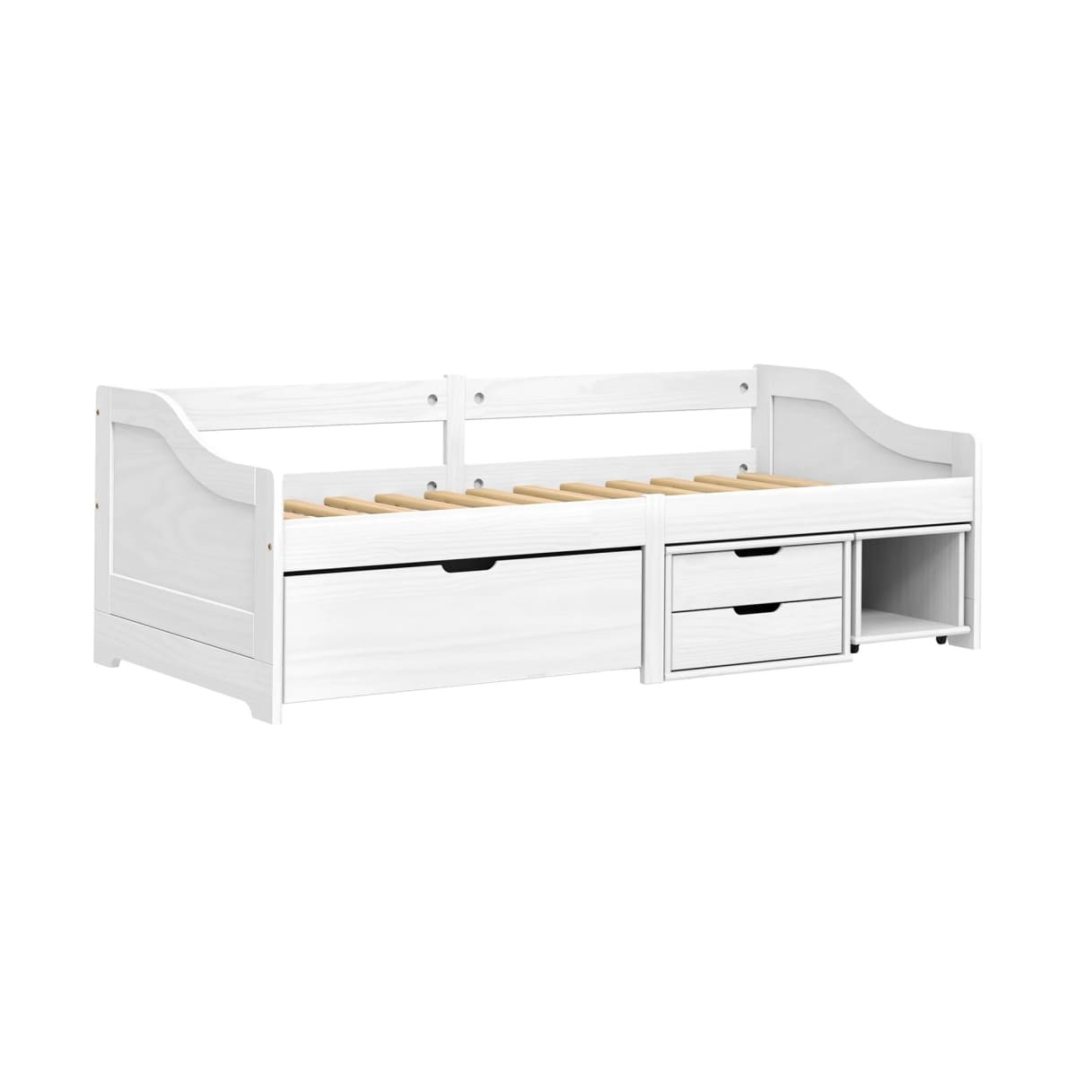 Este versátil sofá cama de madera se puede usar como cama en el dormitorio y también encaja a la perfección como sofá en el salón. Se adapta perfectamente a tus diferentes necesidades, lo que te proporciona mucho espacio para dormir y descansar. Madera maciza de pino: La madera maciza de pino es un bonito material natural. La madera de pino tiene vetas rectas, y los nudos dan al material su distintivo aspecto rústico. Esta cama para invitados está hecha de madera maciza de pino, más estable y duradera.Diseño de listones: El somier de madera proporciona una mejor circulación del aire para mantener el colchón fresco durante más tiempo, además de mejorar la capacidad de carga de la cama y de asegurar su estabilidad.Sofá cama multiusos: Este sofá cama de madera se puede utilizar como sofá durante el día o como cama por la noche. Es una solución rápida para alojar invitados por la noche sin ocupar mucho espacio.Espacio de almacenamiento adicional: Aprovecha al máximo el espacio que hay debajo de la cama para guardar varios objetos. Perfecto para guardar tu ropa, zapatos, juguetes o edredones. Información útil:El colchón no está incluido con la cama. Disponemos de una variada selección de colchones. Puedes echar un vistazo a nuestra tienda para buscar el colchón correspondiente.