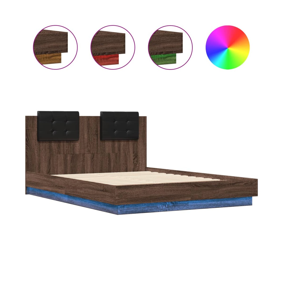 ¡Consigue tener un sueño más reparador con esta estructura de cama con cabecero y luces LED! Es un aporte acogedor para cualquier dormitorio. Material duradero: La madera de ingeniería tiene una calidad excepcional, con una superficie lisa y también cuenta con fuerza, estabilidad y resistencia a la humedad.Luces LED RGB: La estructura de cama está equipada con luces LED RGB. Con varios menús personalizables, puedes cambiar fácilmente el color de las luces e incluso configurarlas para que se ajusten automáticamente. Estas luces LED no sólo realzan el aspecto moderno de la base de la cama, sino que también aumentan su atractivo.Excelente soporte: El cabecero de la cama brinda un excelente soporte para la espalda mientras estás sentado en la cama para leer o ver la televisión.Listones robustos: Los listones de madera contrachapada proporcionan una buena distribución del peso, lo que garantiza que el colchón se mantenga en tu sitio con cada giro y vuelta del cuerpo mientras duermes. Información útil:El colchón no está incluido con la cama. Disponemos de una variada selección de colchones. Puedes echar un vistazo a nuestra tienda para buscar el colchón correspondiente.El producto tiene un conector USB que necesita una fuente de alimentación USB certificada de 5 V (no incluida).