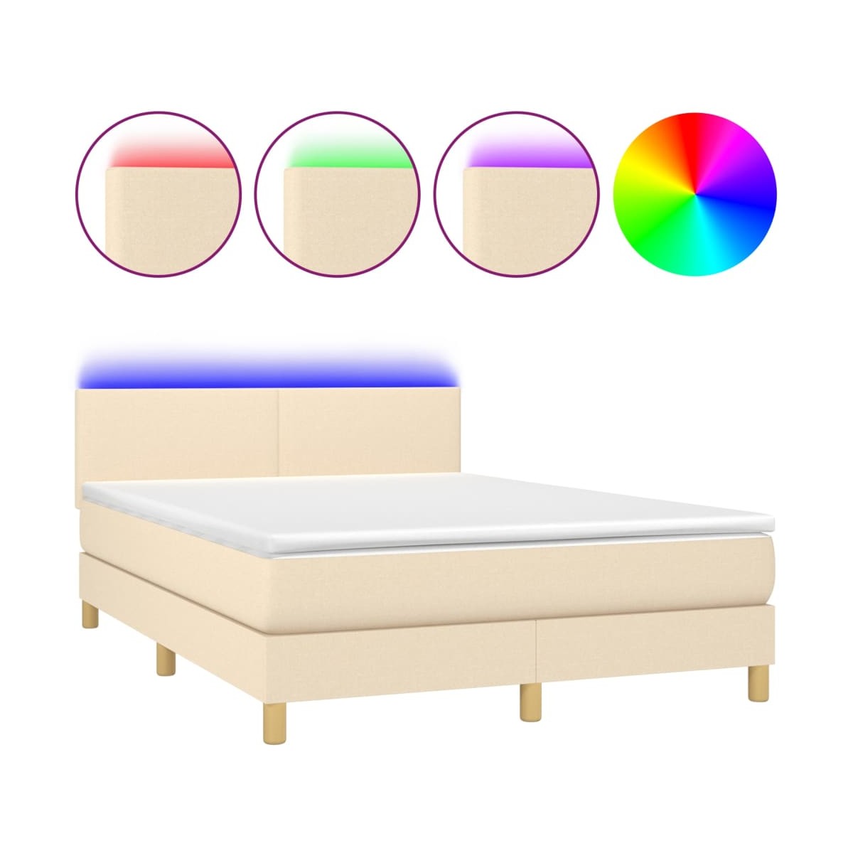 Utiliza esta cama box spring con colchón y LED para disfrutar de un sueño reparador. Es el centro de atención de tu dormitorio. Material de primera calidad: La tela posee un aspecto sencillo y limpio, y es transpirable y duradera.Cabecero práctico: El cabecero de la cama es ajustable en altura según tus preferencias. El cabecero de la cama te proporciona un excelente apoyo para la espalda mientras estás sentado en la cama para leer o ver la televisión.Tira de LED de colores: Alegra la oscuridad con luces LED de colores.Colchón de muelles ensacados: El muelle ensacado individual incorporado es conocido por su altísima calidad, al tiempo que garantiza un alto nivel de durabilidad y adaptabilidad. Puede absorber eficazmente el ruido y los golpes causados por los lanzamientos y los giros.Protector de colchón respetuoso con la piel: El protector de colchón tiene una funda de tejido resistente y respetuoso con la piel, que lo hace suave y confortable. Nota:Por razones de higiene, el colchón no puede devolverse si se ha quitado o abierto el embalaje.Cada producto viene con un manual de montaje en la caja para facilitar el montaje.Únicamente puedes cortar por la parte con el símbolo de las tijeras y únicamente la parte con el USB seguirá funcionando como antes.El producto tiene un conector USB, pero no se incluye la fuente de alimentación USB de 5 V certificada.
