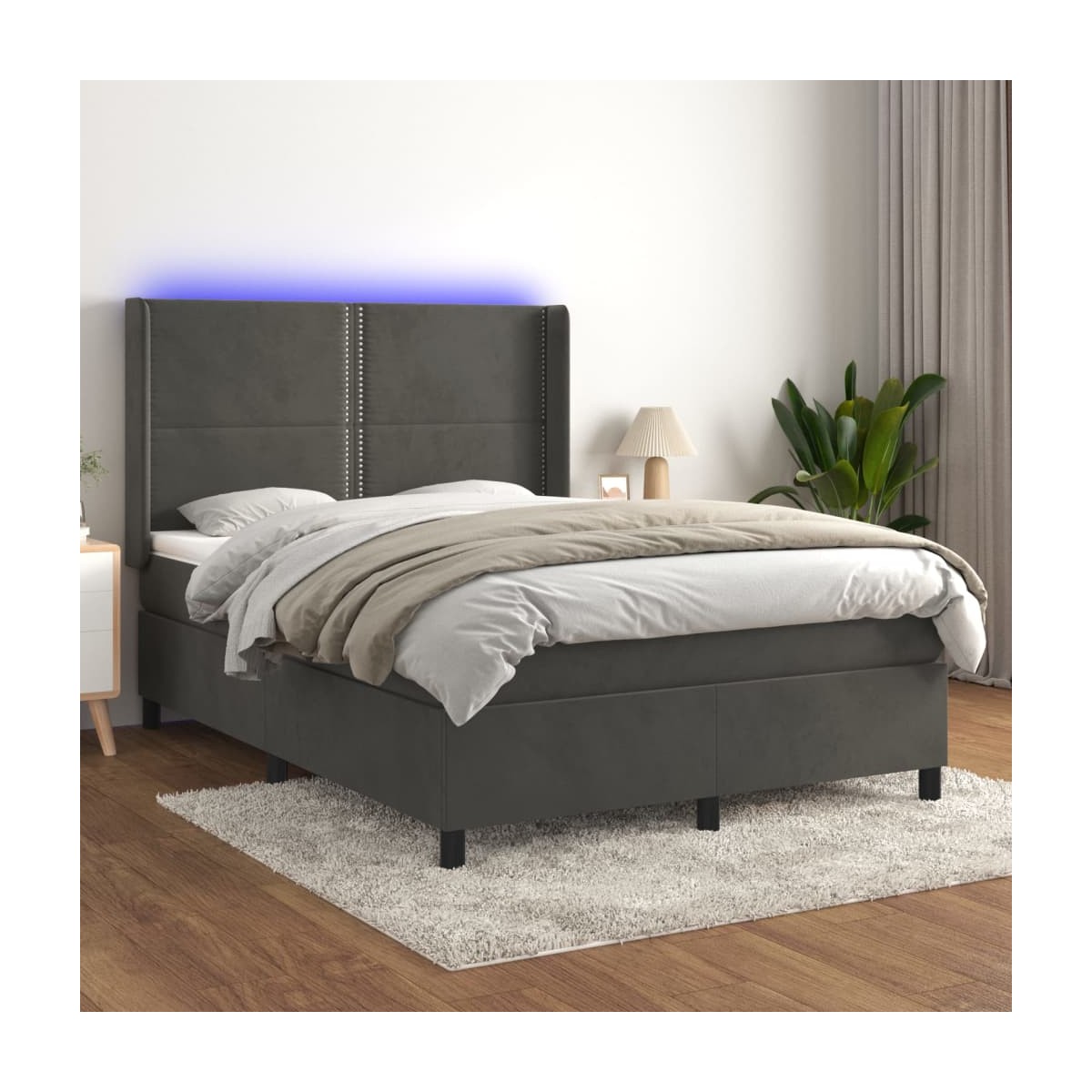 Utiliza esta cama tipo box spring con colchón y luces LED para disfrutar de un sueño reparador. Será el centro de atención del dormitorio. Terciopelo suave: El terciopelo es una tela suave y lujosa, reconocida por su denso pelo de fibras cortadas de forma uniforme que tienen una suave pelusa. La tela de terciopelo posee un característico y suave tacto, lo que hace que sea cómoda al tacto.Cabecero práctico: El cabecero de la cama es ajustable en altura según tus preferencias. El cabecero de la cama te proporciona un excelente apoyo para la espalda mientras estás sentado en la cama para leer o ver la televisión.Tira de LED de colores: Alegra la oscuridad con luces LED de colores.Colchón de muelles ensacados: El muelle ensacado individual incorporado es conocido por su altísima calidad, al tiempo que garantiza un alto nivel de durabilidad y adaptabilidad. Puede absorber eficazmente el ruido y los golpes causados por los lanzamientos y los giros.Protector de colchón respetuoso con la piel: El protector de colchón tiene una funda de tejido resistente y respetuoso con la piel, que lo hace suave y confortable. Nota:Por razones de higiene, el colchón no puede devolverse si se ha quitado o abierto el embalaje.Únicamente puedes cortar por la parte con el símbolo de las tijeras y únicamente la parte con el USB seguirá funcionando como antes.Cada producto viene con un manual de montaje en la caja para facilitar el montaje.El producto tiene un conector USB, pero no se incluye la fuente de alimentación USB de 5 V certificada.