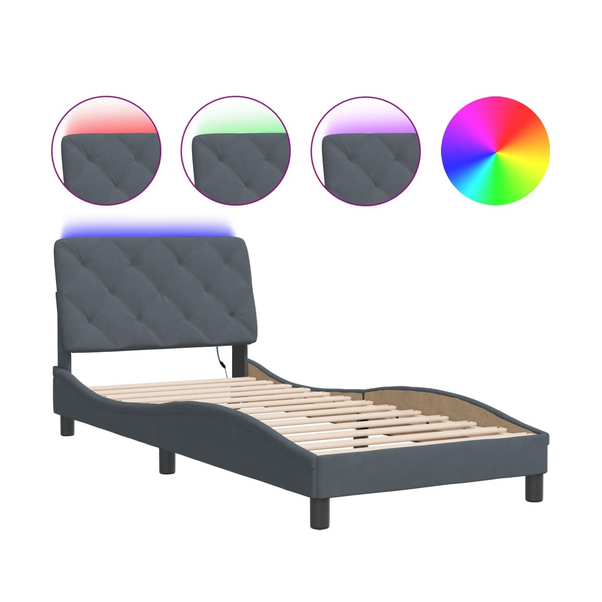 ¡Consigue tener un sueño reparador con esta estructura de cama con luces LED! Es un aporte acogedor para cualquier dormitorio. Terciopelo suave: El terciopelo es una tela suave y cálida, agradable al tacto. Listones robustos: Los listones de madera contrachapada proporcionan una buena distribución del peso, lo que garantiza que el colchón se mantenga en tu sitio con cada giro y vuelta del cuerpo mientras duermes. Excelente soporte: El cabecero acolchado está relleno de espuma para una comodidad ultrasuave y óptima, lo que te brinda un excelente soporte para la espalda mientras estás sentado en la cama para leer o ver la televisión. Tira de LED de colores: Alegra la oscuridad con luces LED de colores. Los cierres de gancho y bucle de la parte posterior del cojín del cabecero se pueden utilizar para fijar las luces LED. Diseño lateral ondulado: El look ondulado de la estructura de la cama es elegante y sofisticado, agregando un toque moderno y elegante a tu decoración, convirtiéndolo en el foco de atención de tu dormitorio. Información útil:El colchón no está incluido con la cama. Disponemos de una variada selección de colchones. Puedes echar un vistazo a nuestra tienda para buscar el colchón correspondiente.El producto tiene un conector USB que necesita una fuente de alimentación USB certificada de 5 V (no incluida).