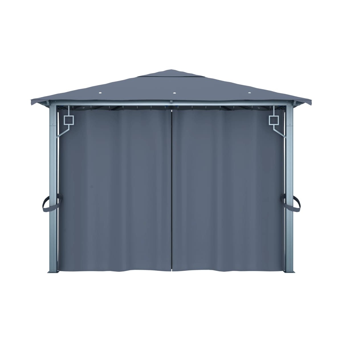Este cenador con cortinas presenta un diseño clásico y elegante. Será el refugio perfecto para eventos al aire libre, como cenas, barbacoas, reuniones familiares, y demás actividades. El techo, hecho de tela Oxford con pintura PA, protege del resplandor y los dañinos rayos UV de la luz solar directa. El cenador está sólidamente construido con aluminio y acero macizo y, por lo tanto, es resistente a la oxidación y muy estable. El pabellón se entrega con 4 paredes laterales, que se pueden recoger con mal tiempo. También se incluyen las pantallas de malla para mantener alejados a los insectos y garantizar la buena circulación del aire. Asimismo, también posee cierres de gancho y bucle para facilitar la fijación. El cenador se fija fácilmente al suelo con los accesorios de montaje incluidos. Es fácil de montar. NOTA: Este producto NUNCA se debe usar con mal tiempo, como fuertes vientos, fuertes lluvias, nieve, tormentas, etc.