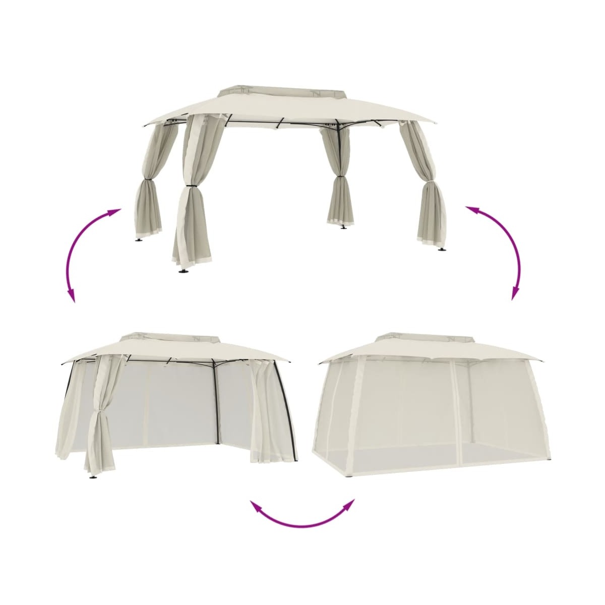Crea momentos inolvidables: ¡reúnete, relájate y disfruta del tiempo en familia bajo tu cenador! Armazón robusto y duradero: Hecha de acero resistente al óxido, el armazón es apreciado para un uso prolongado en exteriores. Garantiza la estabilidad con sólidas vigas para sostener el techo y soportes reforzados.Amplio espacio: Toda la carpa cenador es lo suficientemente grande como para acomodar a tu familia e invitados. También puede sagregar mesas de comedor en el interior.Diseño de techo ventilado de 2 niveles: El cenador adopta un elegante diseño de 2 capas para una gran ventilación y estabilidad, manteniendo el fresco en los días soleados y fortaleciendo la resistencia al viento cuando hace mal tiempo.Protección contra el sol y la lluvia: El techo inclinado está hecho de poliéster duradero con un hermoso diseño de alero, que es resistente al agua y a los rayos UV, lo que crea un lugar ideal para actividades al aire libre. En comparación con las cubiertas planas, evita la acumulación de agua de lluvia y prolonga la vida útil.Paredes laterales de malla transpirable: Las paredes de malla proporcionan una buena circulación de aire y al mismo tiempo, permiten disfrutar de un ambiente relativamente privado con tu familia y amigos. Además, pueden protegerte eficazmente de los molestos insectos, proporcionando un espacio de descanso cómodo. Las cremalleras facilitan la entrada y salida. Información útil:Este producto no es adecuado para usar en condiciones meteorológicas adversas, como vientos fuertes, lluvia intensa, nieve, tormenta, etc.