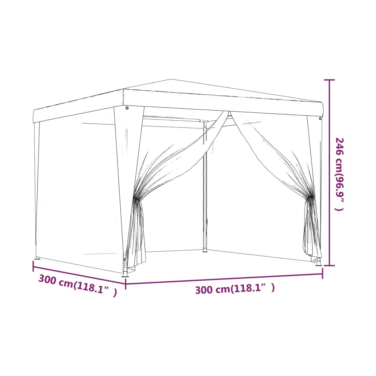 Esta súpermoderna carpa para fiestas, con una resistente estructura de hierro, un tejado resistente al agua y cuatro paredes de malla, es un refugio ideal contra el sol. Material de primera calidad: Este cenador está hecho de polietileno de alta densidad (HDPE) que te protege de la luz del sol directa y permite que corra el aire. El HDPE está especialmente tratado, por lo que también es resistente al agua.Estructura de hierro: La estructura de hierro de este cenador garantiza su solidez y estabilidad.Diseño práctico: La carpa tiene cuatro paredes laterales de malla, que te protegen de los molestos insectos. Y una de las paredes cuenta con una cremallera para facilitar la entrada y el acceso.Amplios usos: Esta carpa para eventos es una opción ideal para una amplia gama de eventos al aire libre, como espectáculos, bodas, fiestas, barbacoas, festivales, etc. Nota:Este producto NUNCA debe usarse con mal tiempo, como vientos fuertes, lluvias intensas, nieve, tormenta, etc.Cada producto viene con un manual de montaje en la caja para facilitar el montaje.