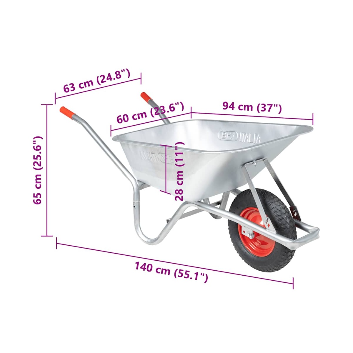¡Utilice esta carretilla para transportar fácilmente productos para jardinería, proyectos de mejoras en el hogar y más! Marco estable y duradero: el marco de acero galvanizado es fuerte, estable, duradero y resistente a la corrosión y al clima severo, lo que garantiza un rendimiento duradero.Alta capacidad de carga: con una capacidad de peso de hasta 150 kg, esta carretilla resistente es perfecta para transportar artículos como tierra, desechos de jardín, leña o herramientas de jardinería.Amplia capacidad: la robusta bandeja con una capacidad de 90 L proporciona mucho espacio para transportar mercancías al tiempo que ofrece una excelente resistencia a la corrosión y un fácil mantenimiento.Movilidad suave: la rueda neumática de la carretilla de jardín garantiza un movimiento suave y confiable incluso en terrenos difíciles, reduciendo la tensión durante el uso.Mango cómodo: el mango de esta carretilla de jardín proporciona un agarre cómodo para maniobrar y controlar fácilmente.