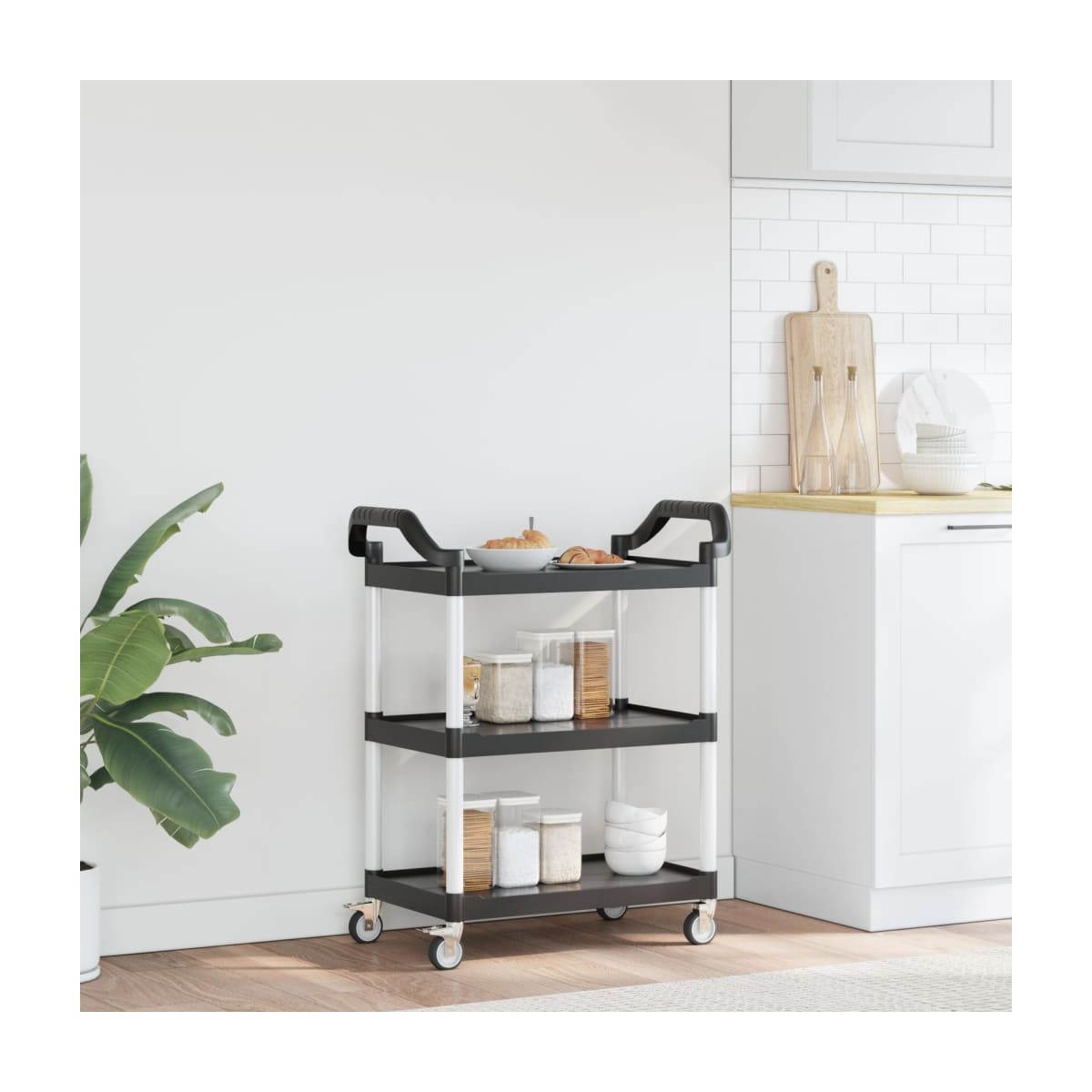 Crea un toque distintivo y añade más espacio de almacenamiento con este carro de 3 niveles. Material duradero: El polipropileno (PP) es un plástico popular y también uno de los materiales más utilizados en muebles de exterior. Es ligero, duro y resistente a los impactos. Además, los tubos de aluminio garantizan la estabilidad y robustez del carro.Amplio espacio de almacenamiento: El carrito de cocina, con 3 estantes, proporciona suficiente espacio para colocar comida, bebidas, jarrones, fruteros u otros artículos decorativos.Movimiento flexible: El carrito para bebidas viene con 4 ruedas de goma y 2 asas, lo que hace que sea fácil y práctico hacerlo rodar donde lo necesites. Además, 2 ruedas se pueden bloquear para mayor control y seguridad.Diversos usos: Este carro de bar se puede utilizar en diferentes entornos, como la cocina, el comedor, la sala de estar o el garaje, y se puede utilizar como carrito de bebidas, carro de cocina o carro de herramientas. Información útil:Un mazo de goma es necesario durante la instalación (no incluido en la entrega).