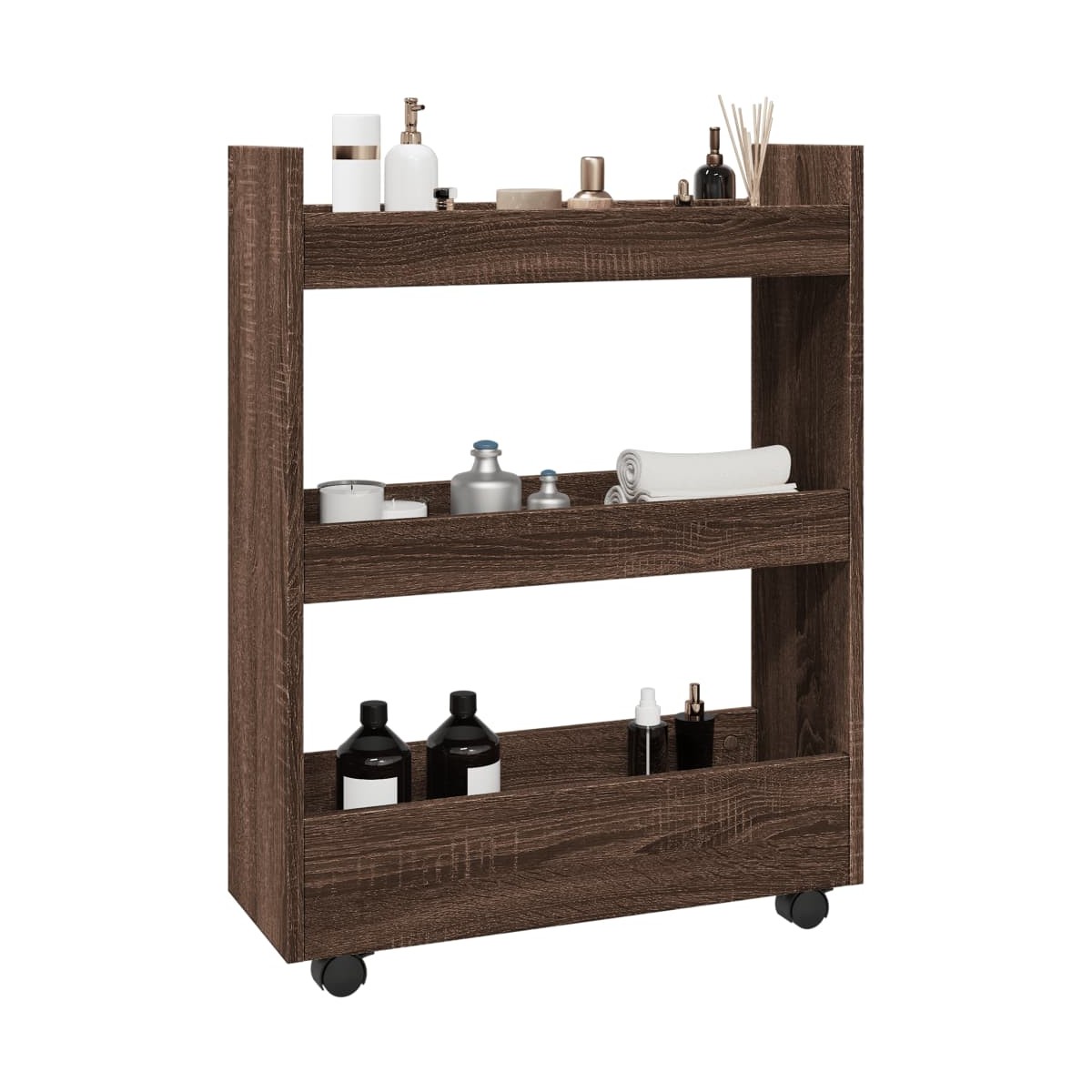 Este carro de almacenamiento estrecho está destinado a ser un aporte decorativo y práctico para tu hogar. Material estable y duradero: La madera de ingeniería es un material duradero y estable con una superficie lisa que es resistente a la humedad, la deformación y la rotura, lo que la convierte en una opción fiable para una variedad de proyectos.Amplio espacio de almacenamiento: El carro de almacenamiento delgado proporciona un amplio espacio de almacenamiento para mantener tus diversos elementos esenciales diarios bien organizados y al alcance de la mano.Fácil de mover: Este carrito rodante, con las cuatro ruedas giratorias incluidas, se puede mover fácilmente al lugar deseado. Dos de las ruedas se pueden bloquear, lo que mantiene el mueble en su sitio y añade estabilidad.Diversos usos: Dependiendo de tus necesidades, puedes utilizar este carro de almacenamiento en la sala de estar, la cocina o el baño gracias a su forma estrecha, incluso en espacios pequeños.